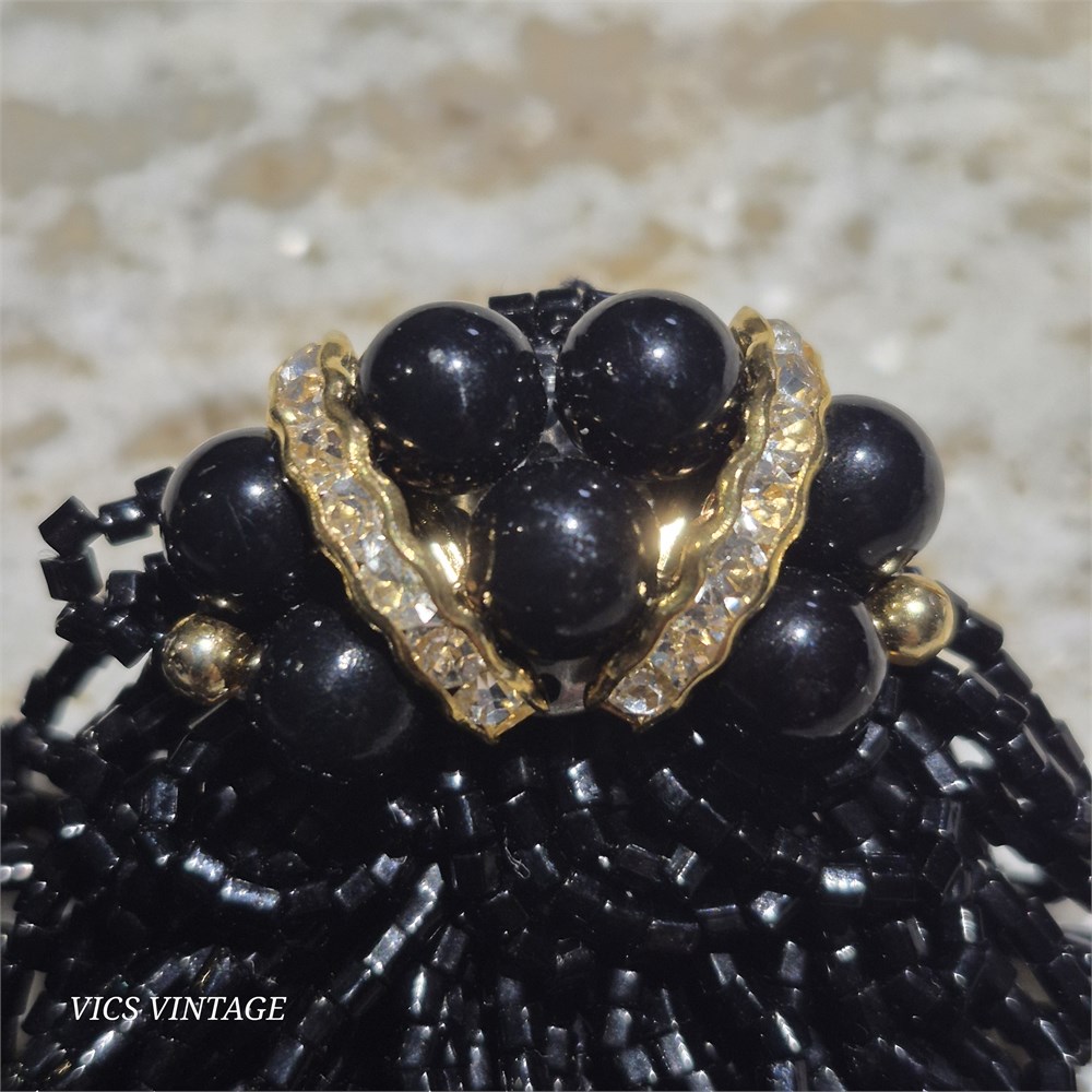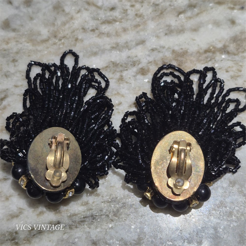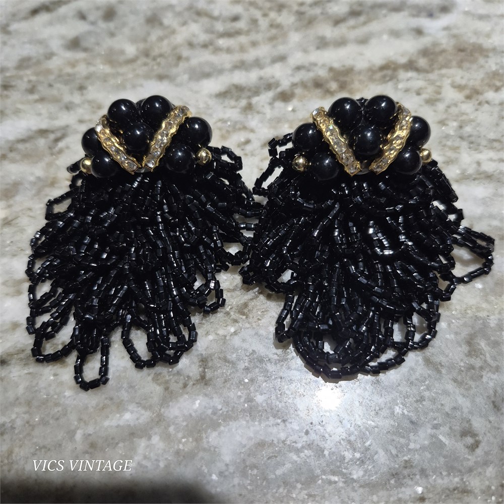 Vintage 1980's black bugle bead loops dangling clip earrings; the dozens of graduated size bead loops start at the sides and wrap around the bottom with shorter, medium and longer loops layered and overlapping to form the dangling tassels. The loops are attached to a backing behind a black cabochon inside a ring of channel set clear rhinestones.