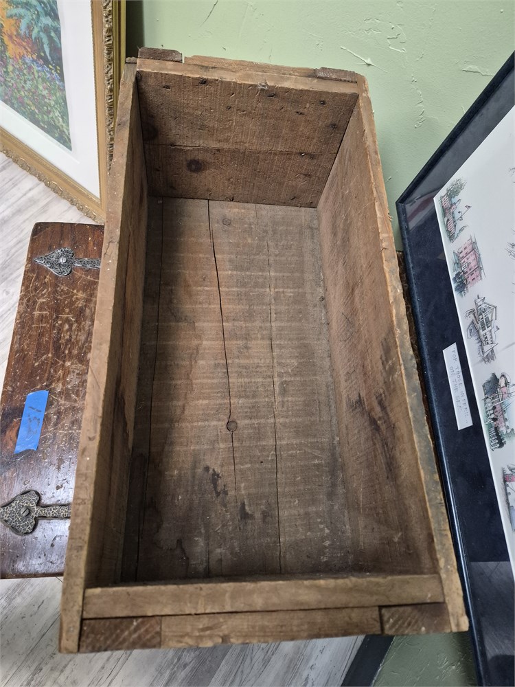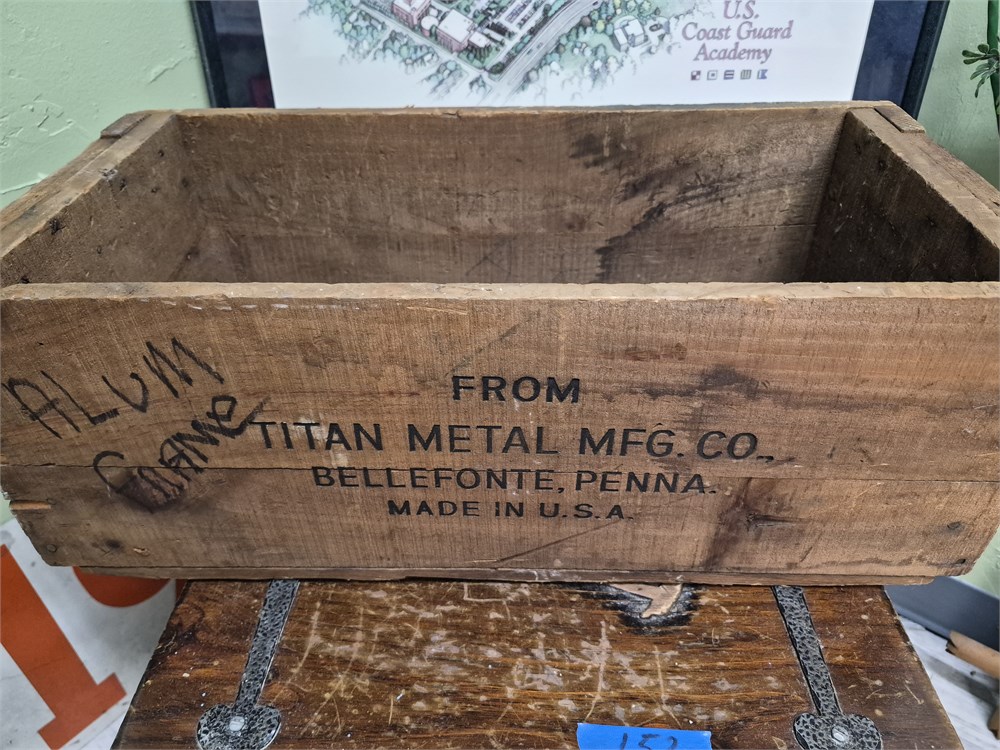 Nice old wooden box from tightened.Metal manufacturing company belfonte, pennsylvania usa box measures, twenty three inches, long, eleven inches, deep and eight and a half inches tall.There is no lid with this box.