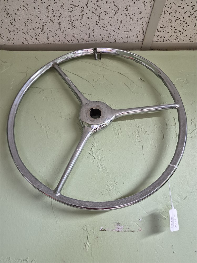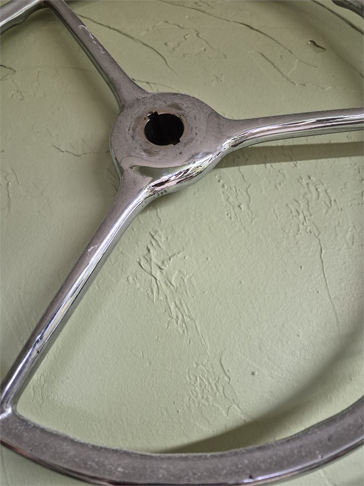 Nice chrome over brass steering wheel.For a boat measures, fifteen inches across center.
