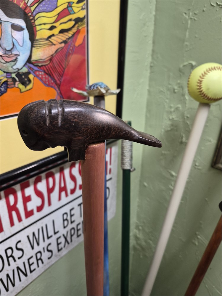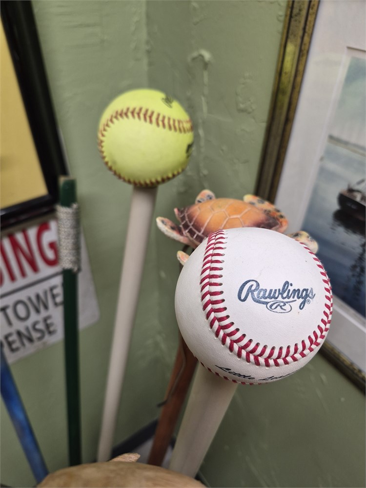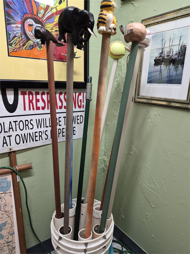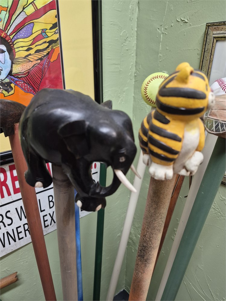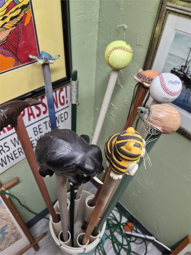 Bucket of walking sticks, there eight sticks included all feature.Some sort of topper, mostly animals, including elephant, turtle, manatee, tiger, Softball and baseball