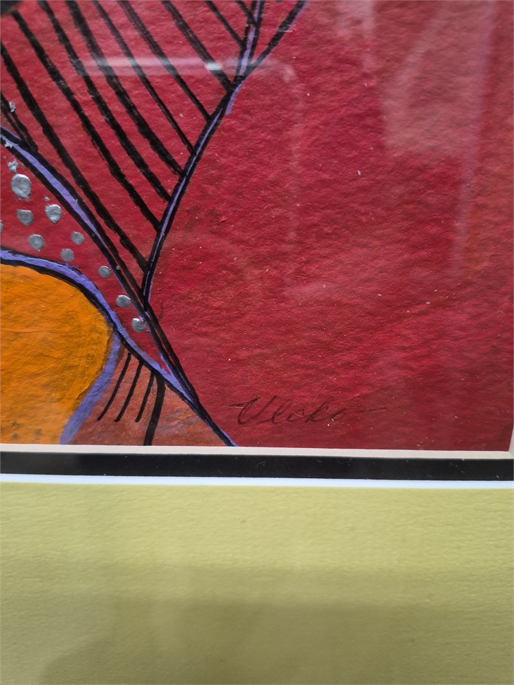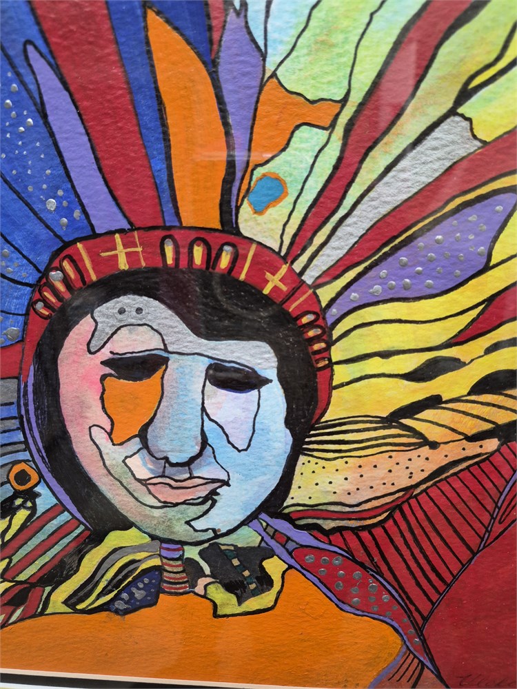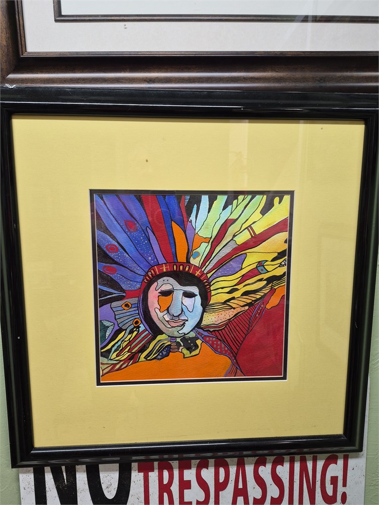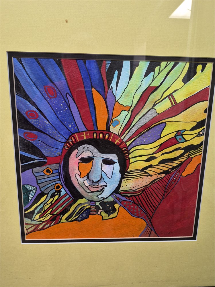 Very colorful signed American Indian art. Peace is framed. 23x23 including frame.