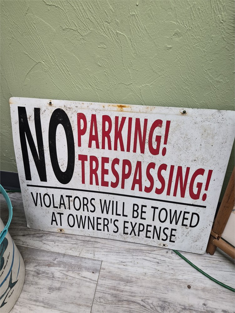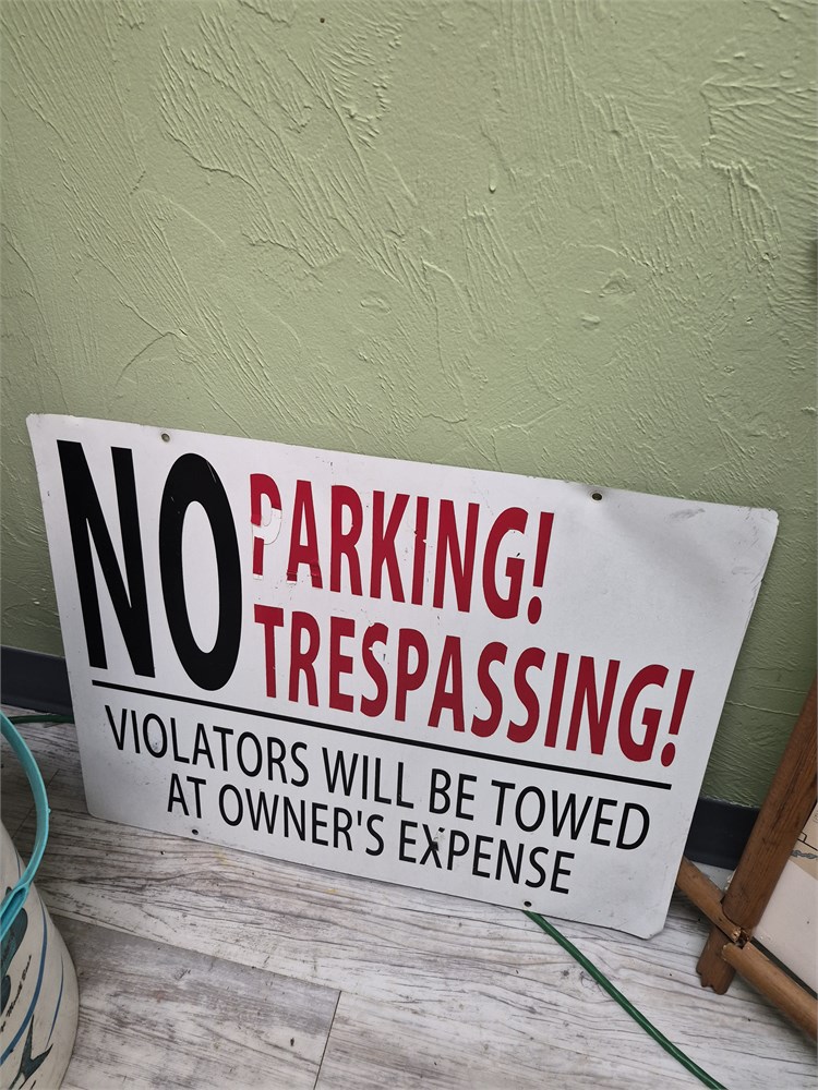No parking trespassing metal sign. Measures 24x18. Sign is two sided.