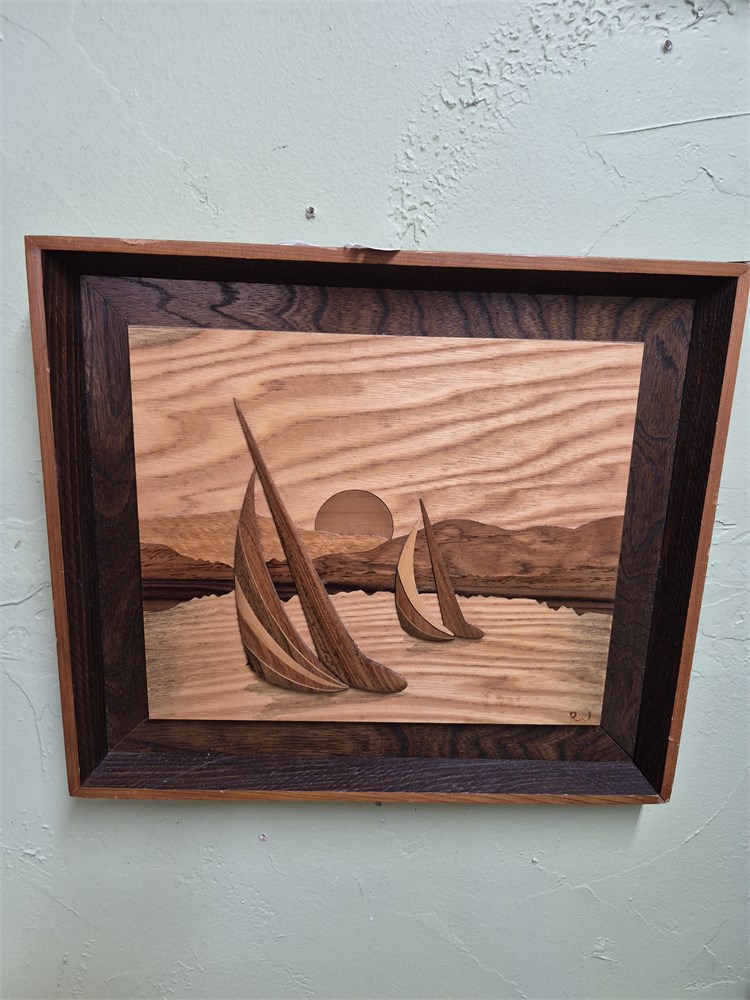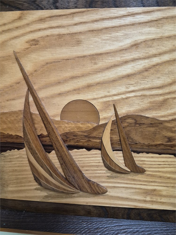 Robert johnson sailboat on lake wood art. Measures approximately 16x12.