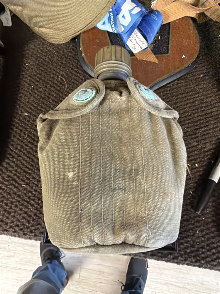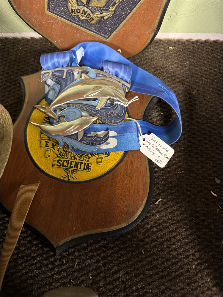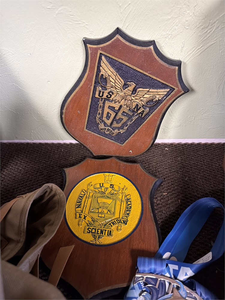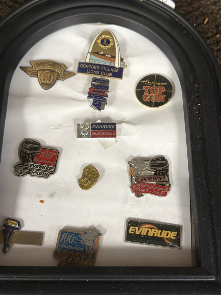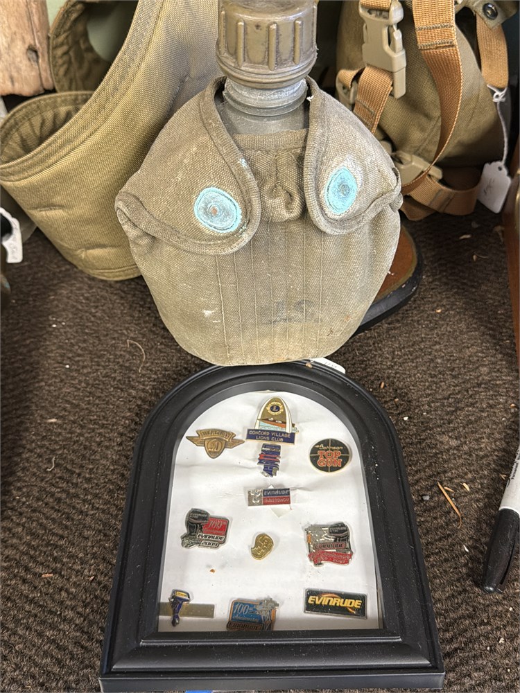 Assortment of military supplies, Santine signed, posters, Tom badgers some outboard motor badge is awesome