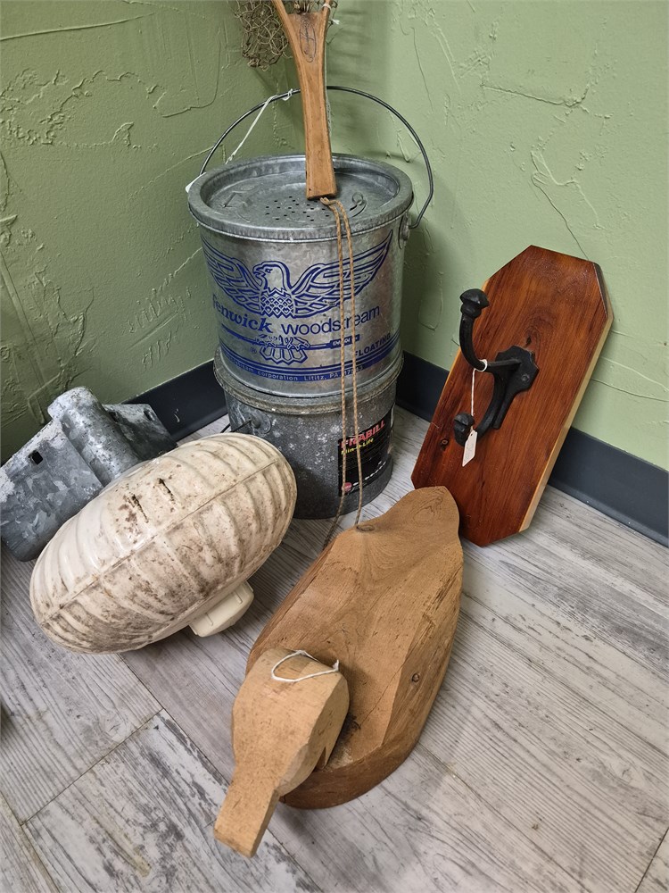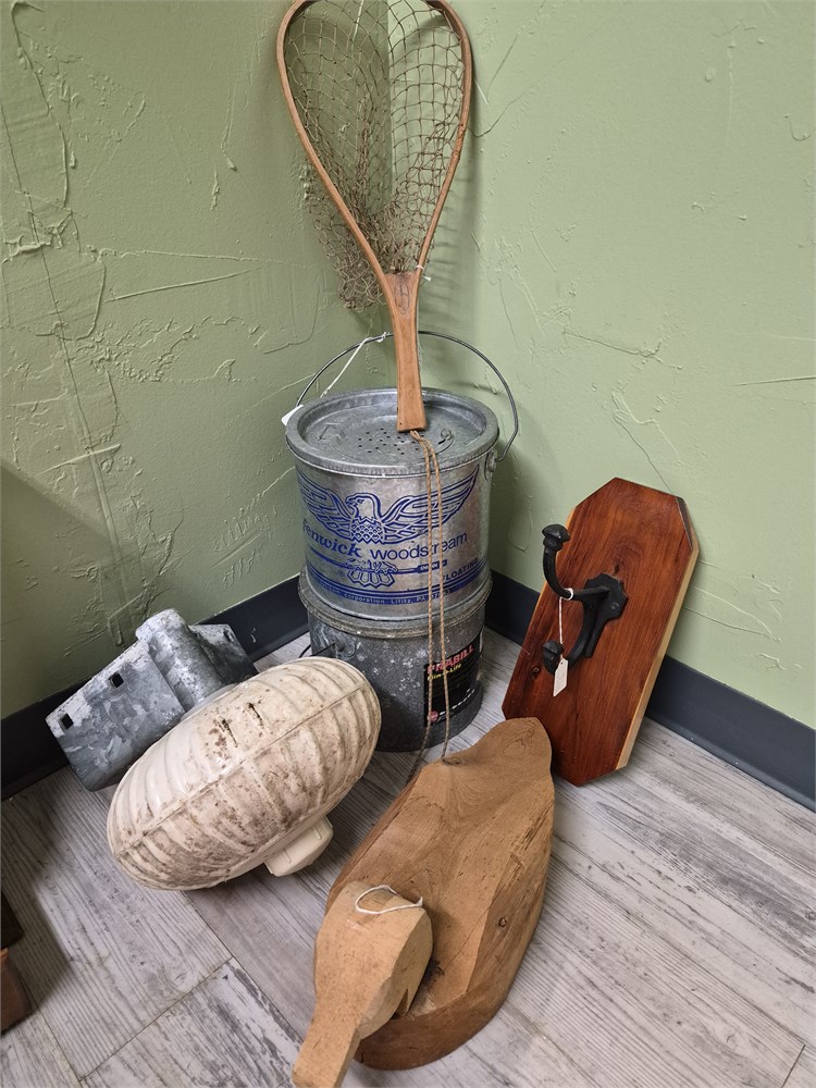 Nice lot of fishing items and collectibles. Includes Bait, Wood Duck, Hook, fish net and wheel.