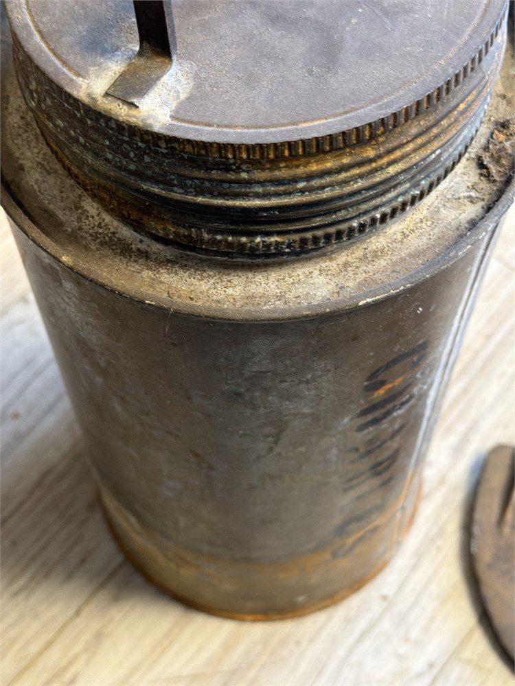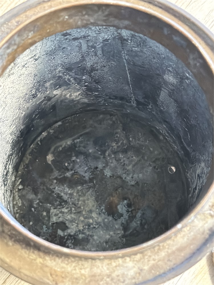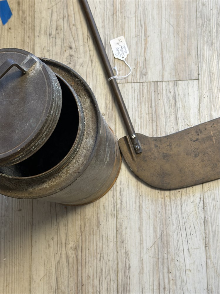 This is a vintage copper and brass fire extinguisher, likely a soda-acid type, with