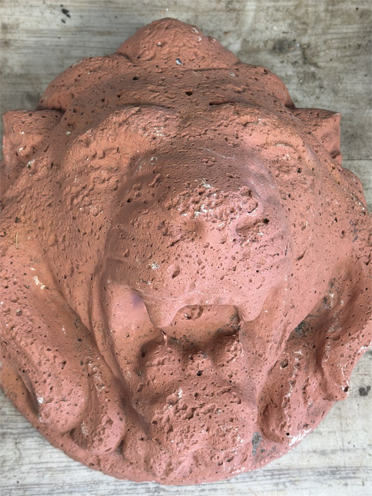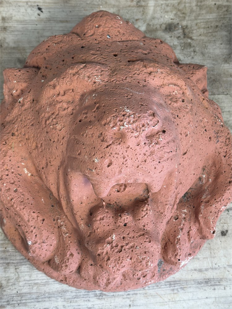 The object is a decorative or garden sculpture, likely a lion or gargoyle head,