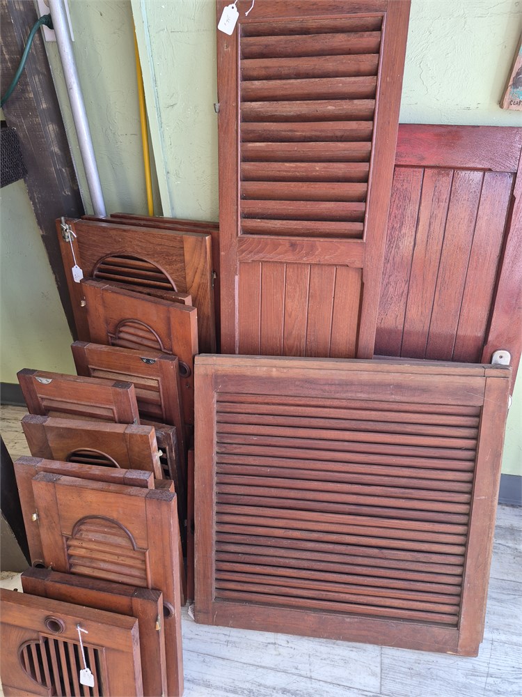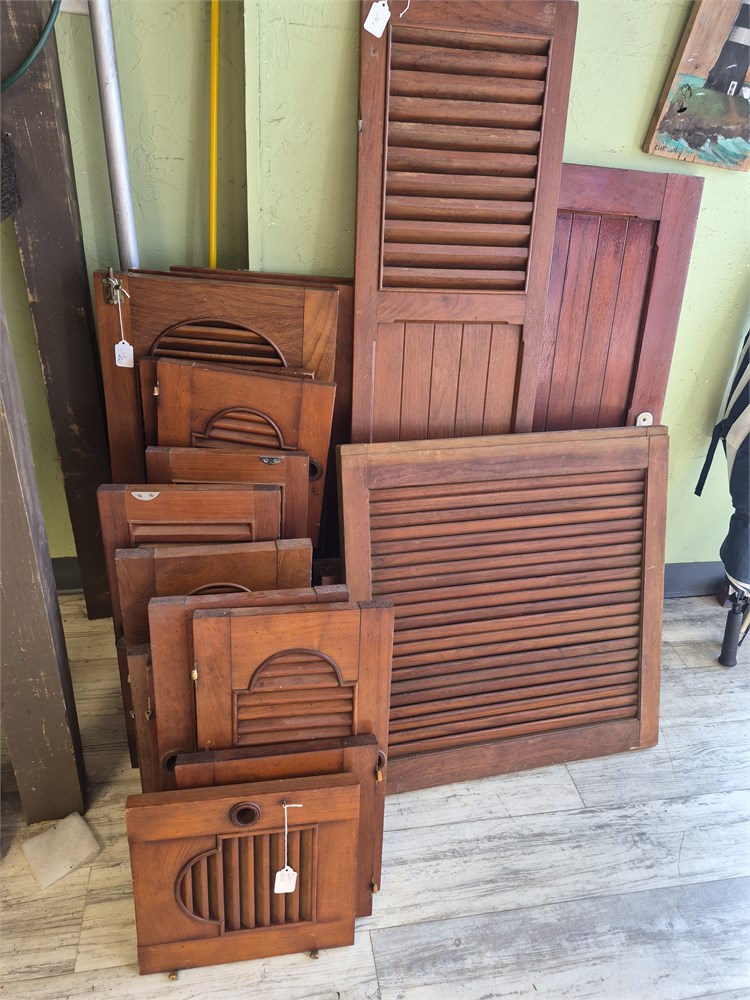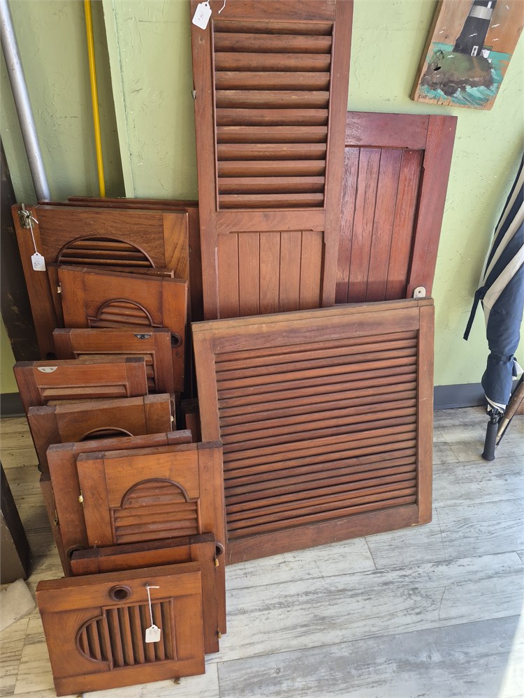 Large group of teakwood boat Vents and doors. There are 25 pieces total in this lot. All look to be in good used condition. These came of a Chris Craft Roamer.