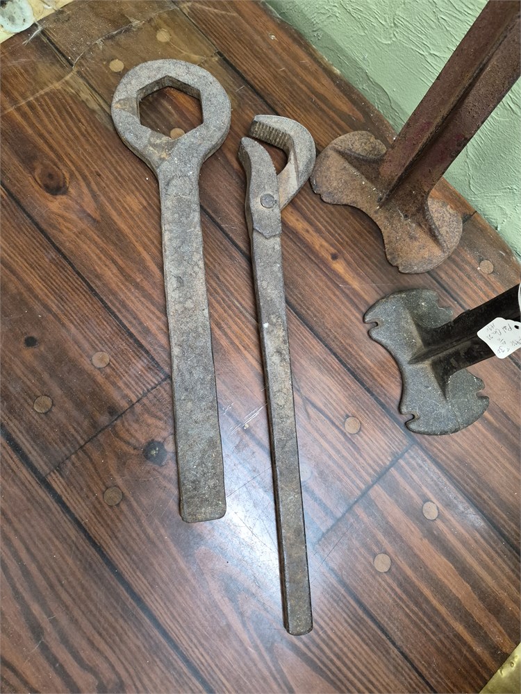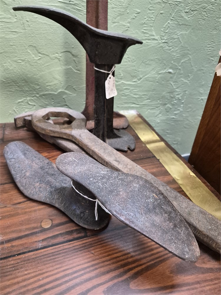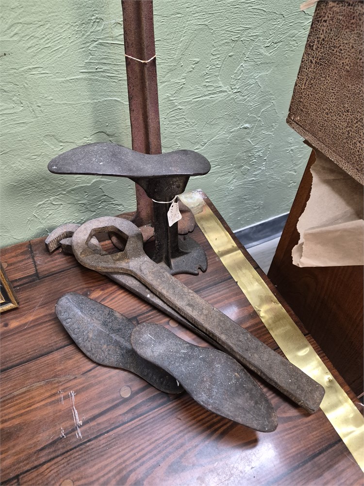 Lot of 5 antique tools three look to be shoe Cobbler stands. The other two are some sort of wrenches.