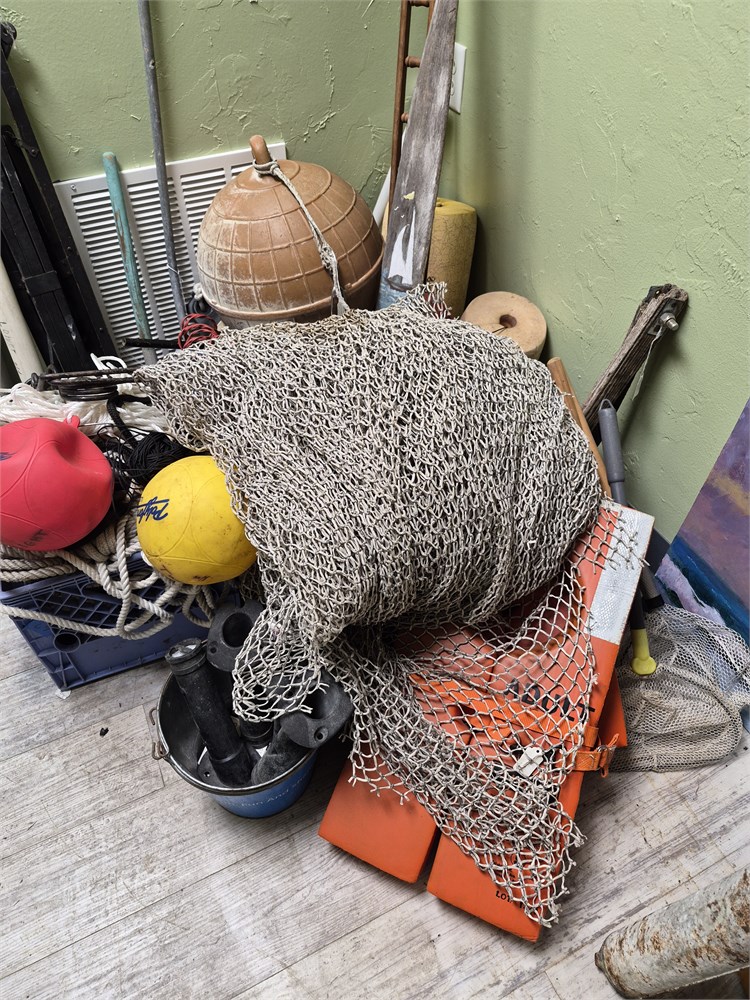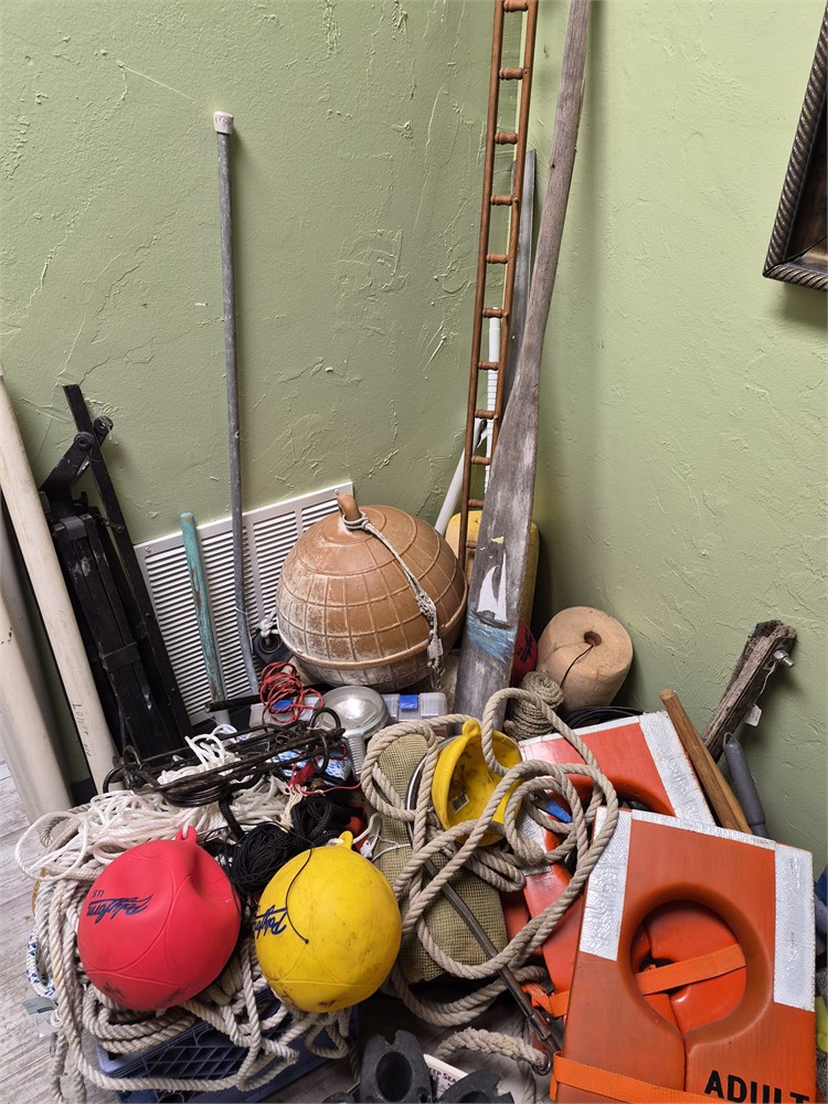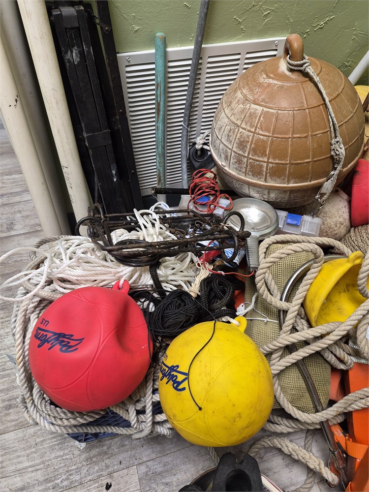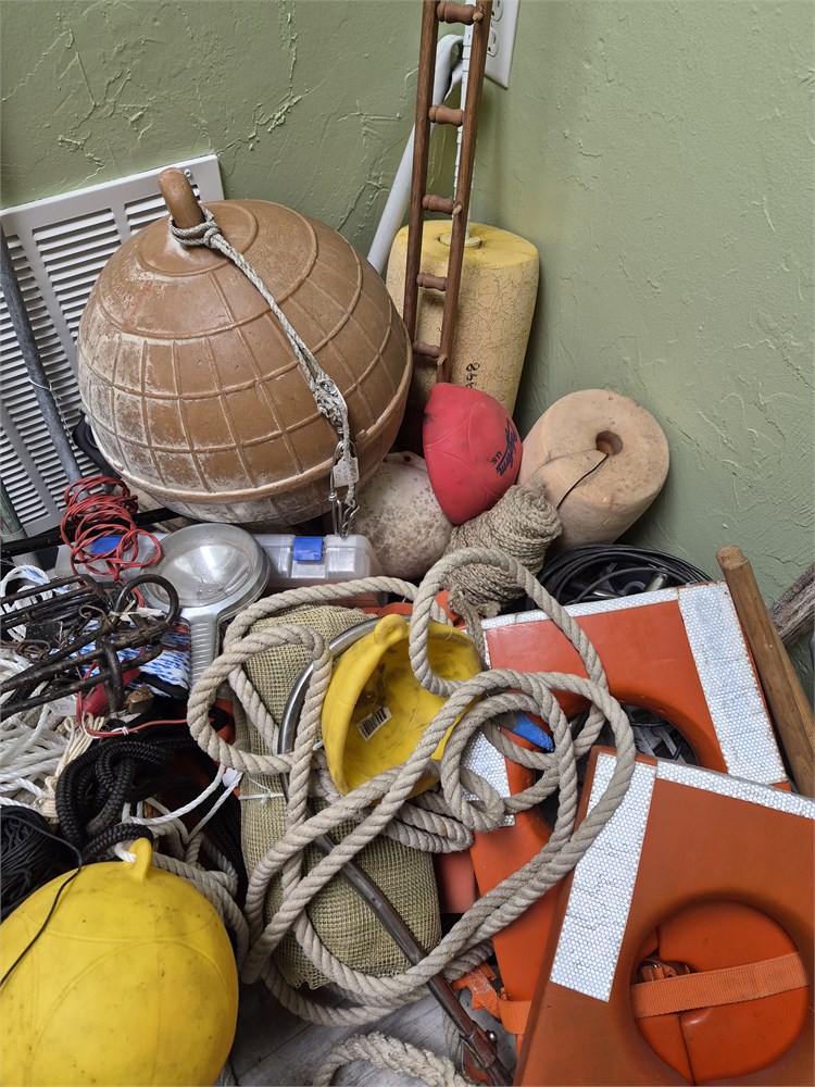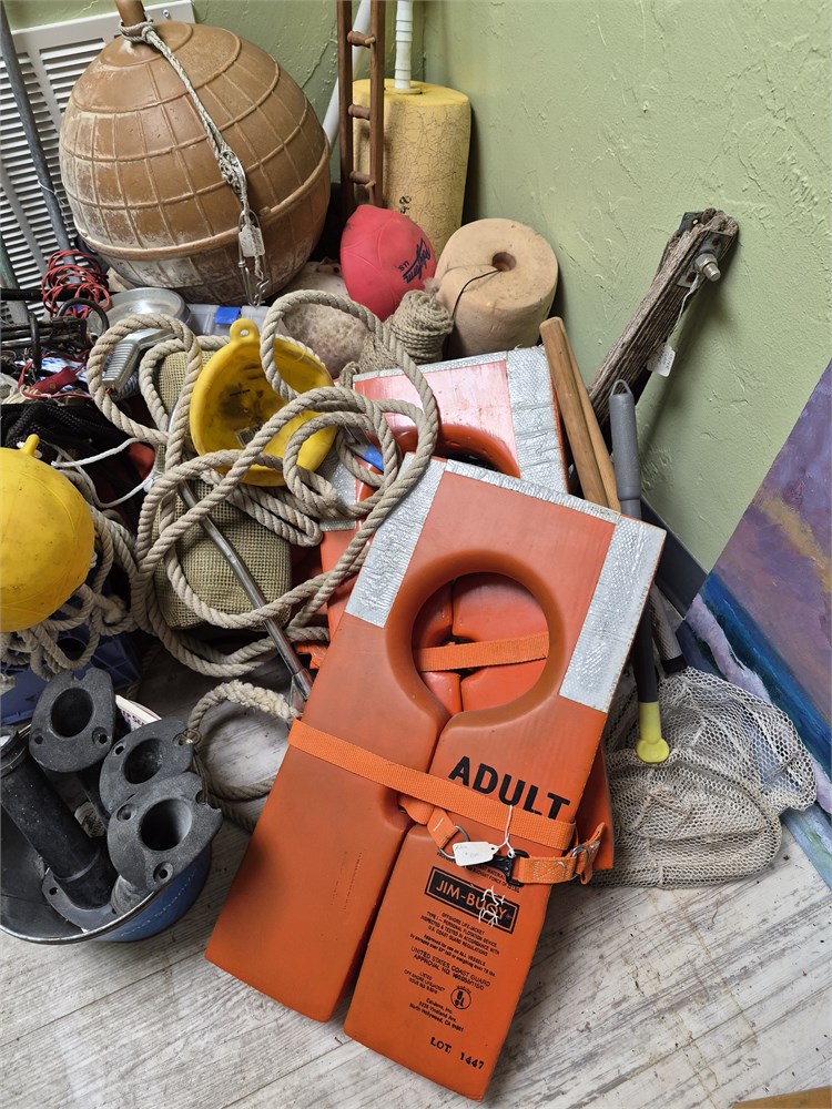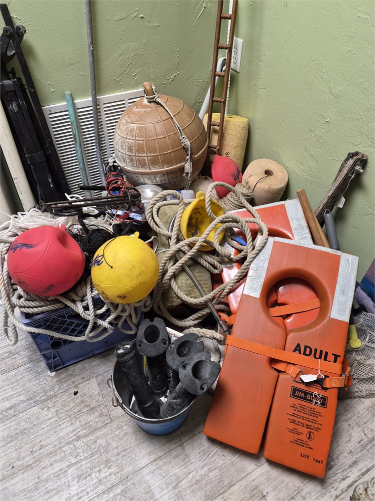Large group of boating accessories includes life jackets, flotations, devices, floaties, boat, ropes, and other items.