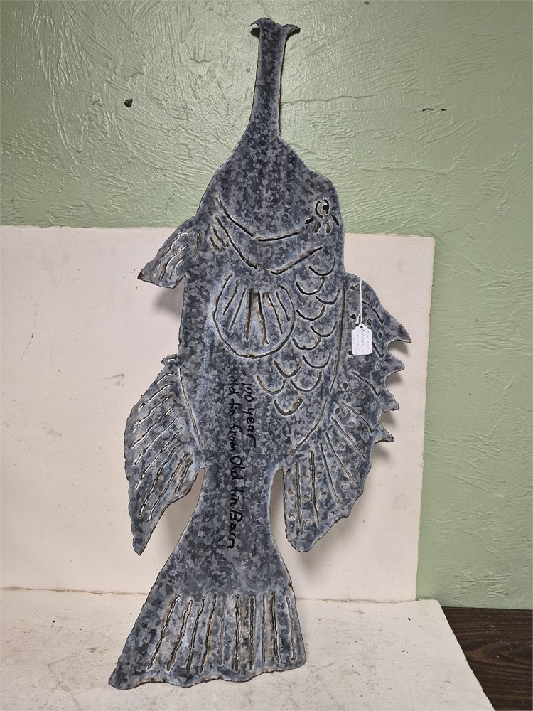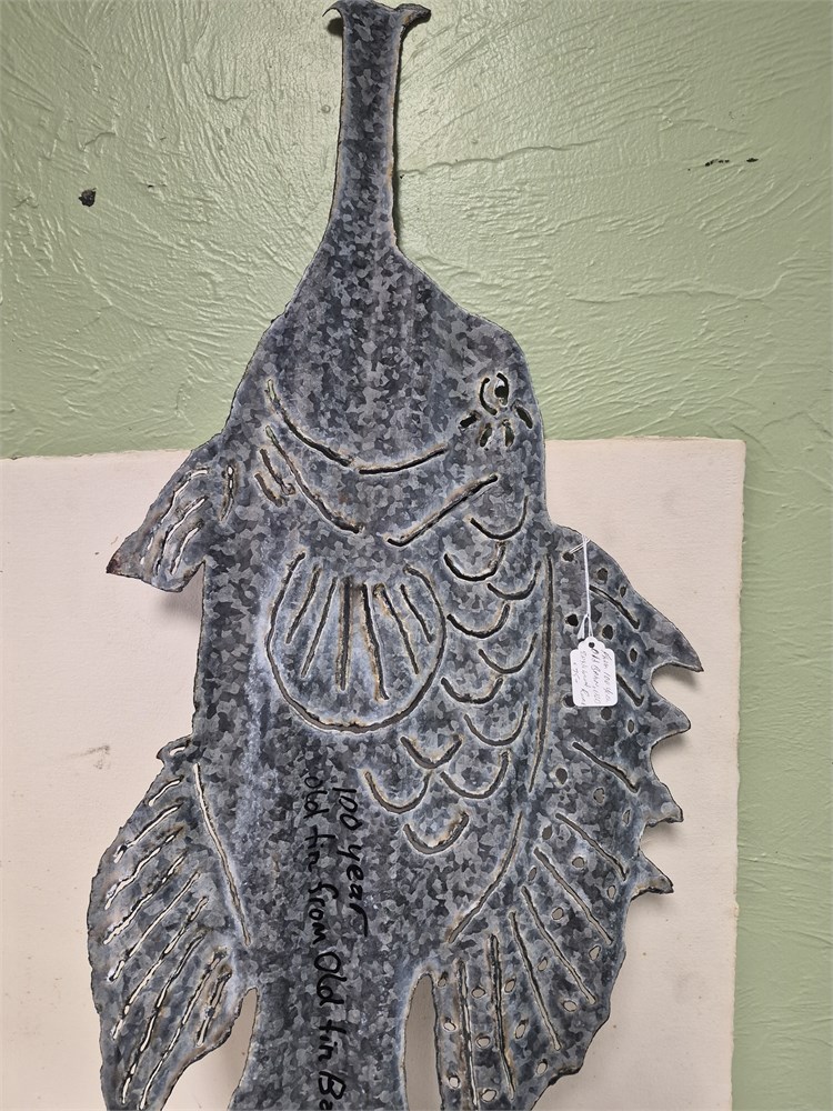 100 year old tin turned into hog Fish Art piece. One side is clean the other rusty. Measures about 35"