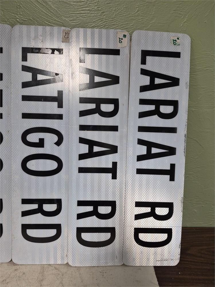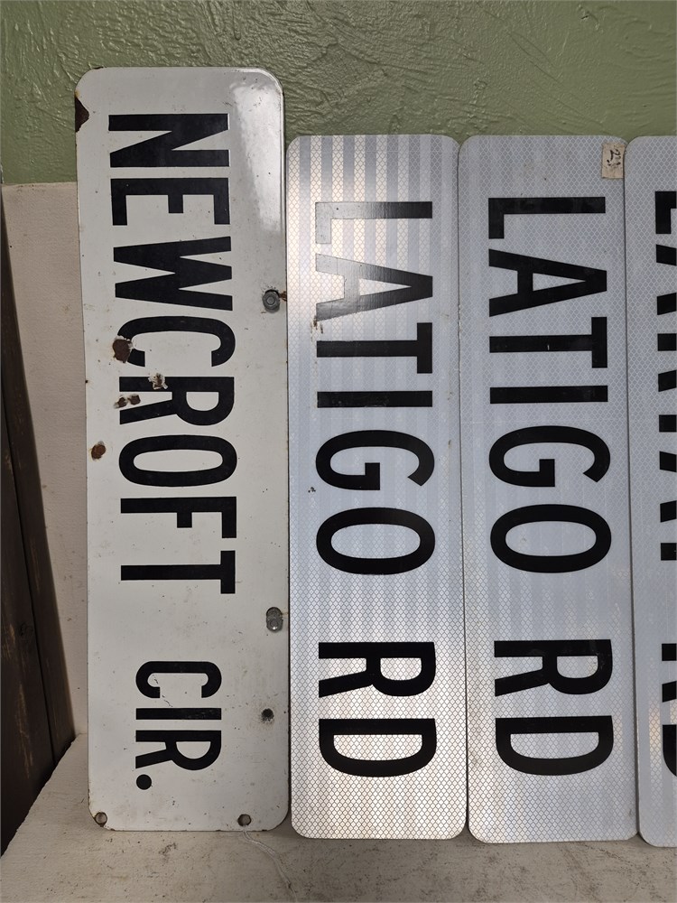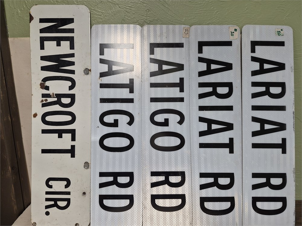 Lot of five metal street signs. 4 Signs measure 24x6 the larger measures 26x7. Signs are front and back.