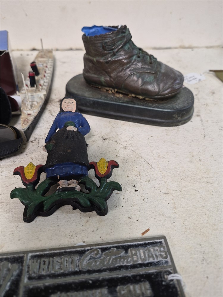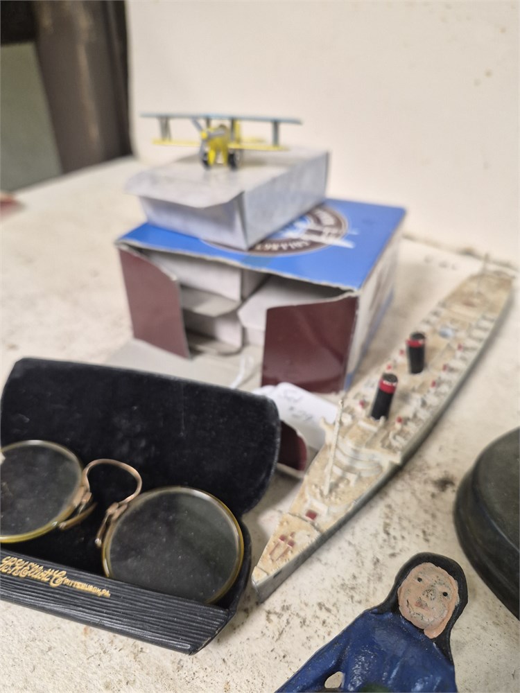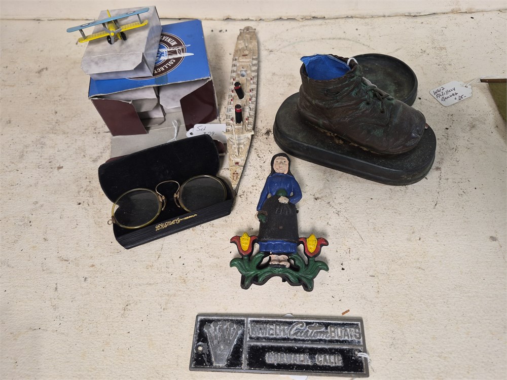 Lot of collectibles. Includes set of 4 BI Planes, Queen Mary, glasses, a bronze shoe and other items.