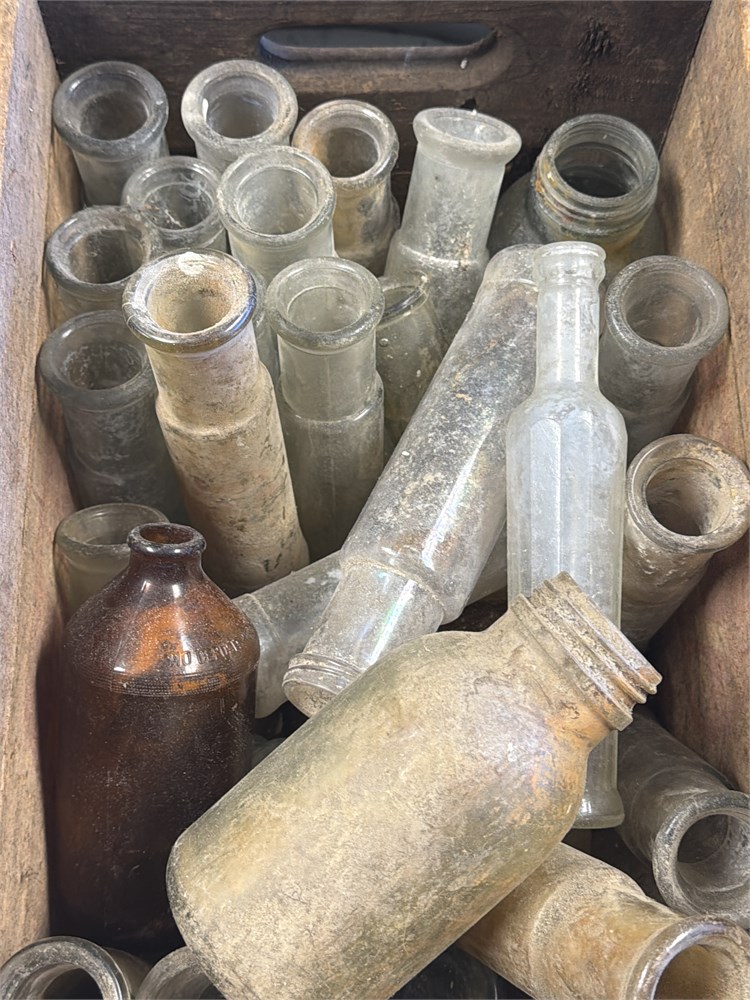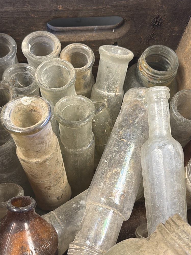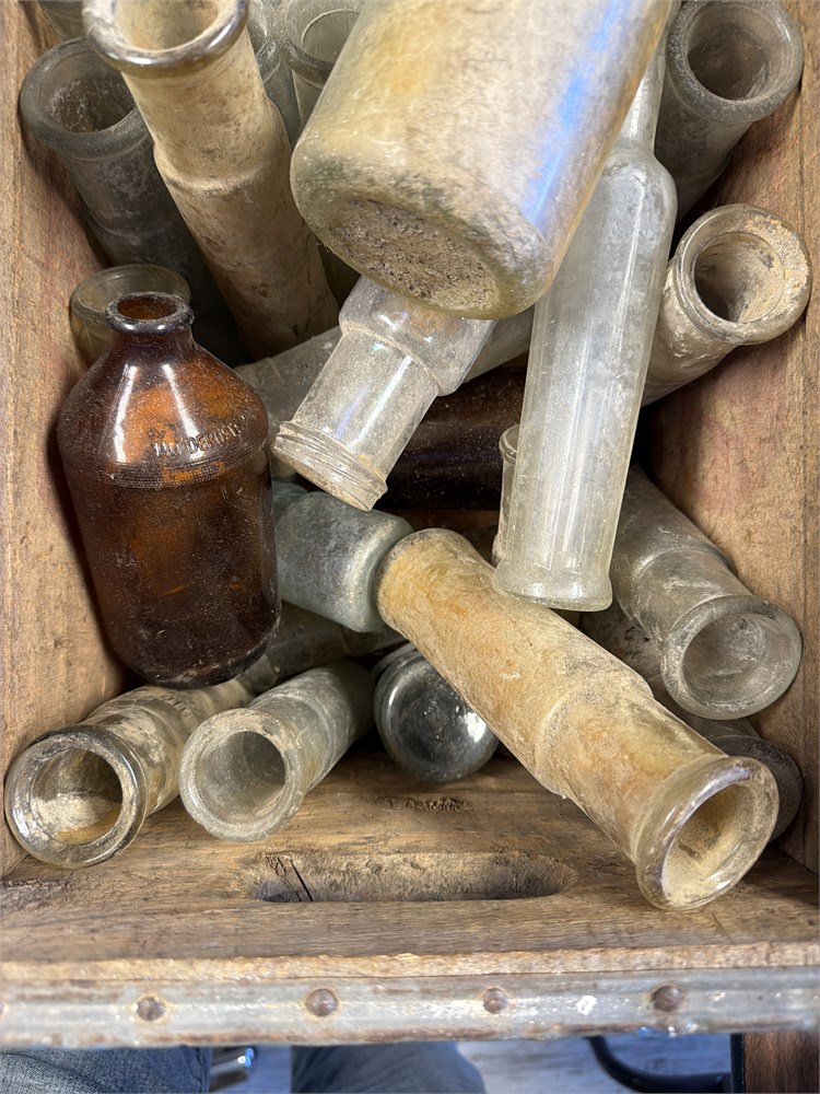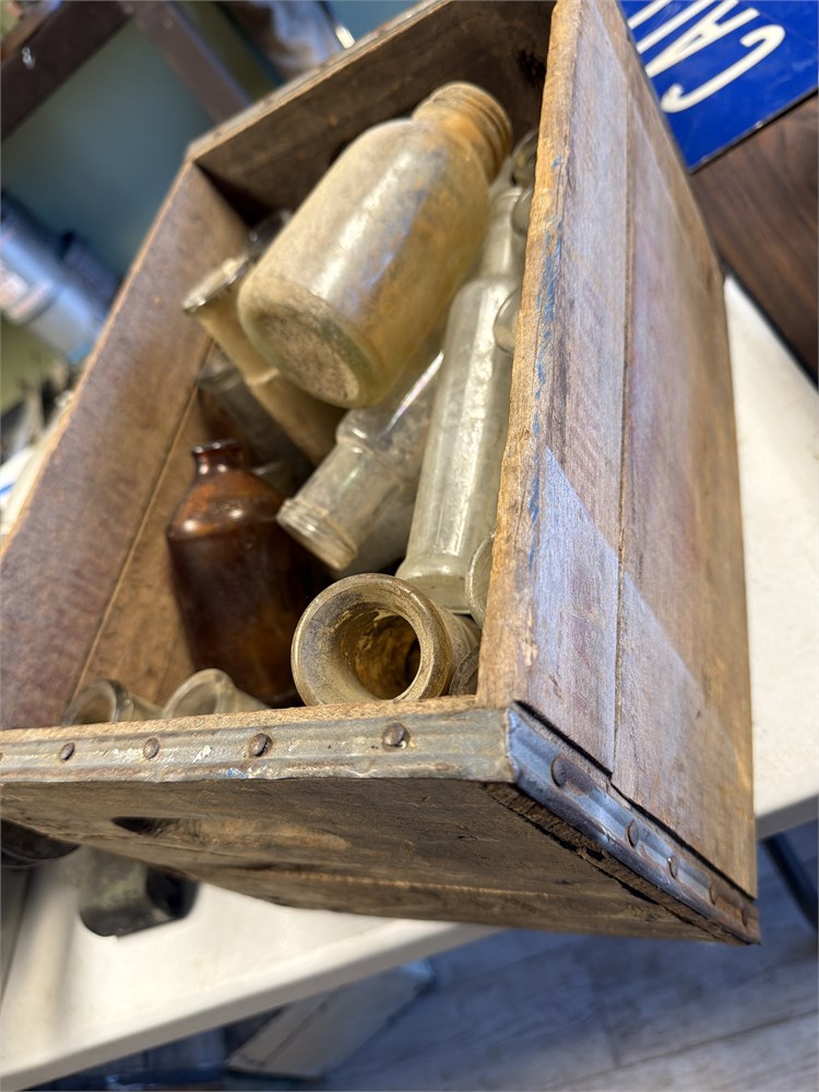 Vintage glass medicine bottles and old wood crate assortment of different kind of styles in sizes