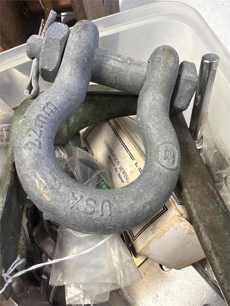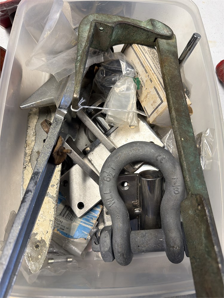 Boat tiedowns, brass items, stainless steel items all for using in boats in plastic tub