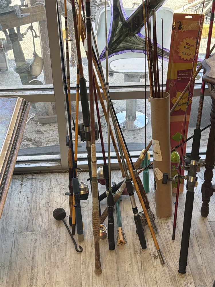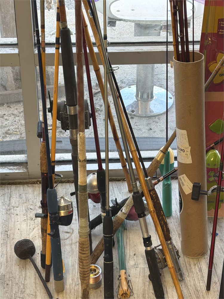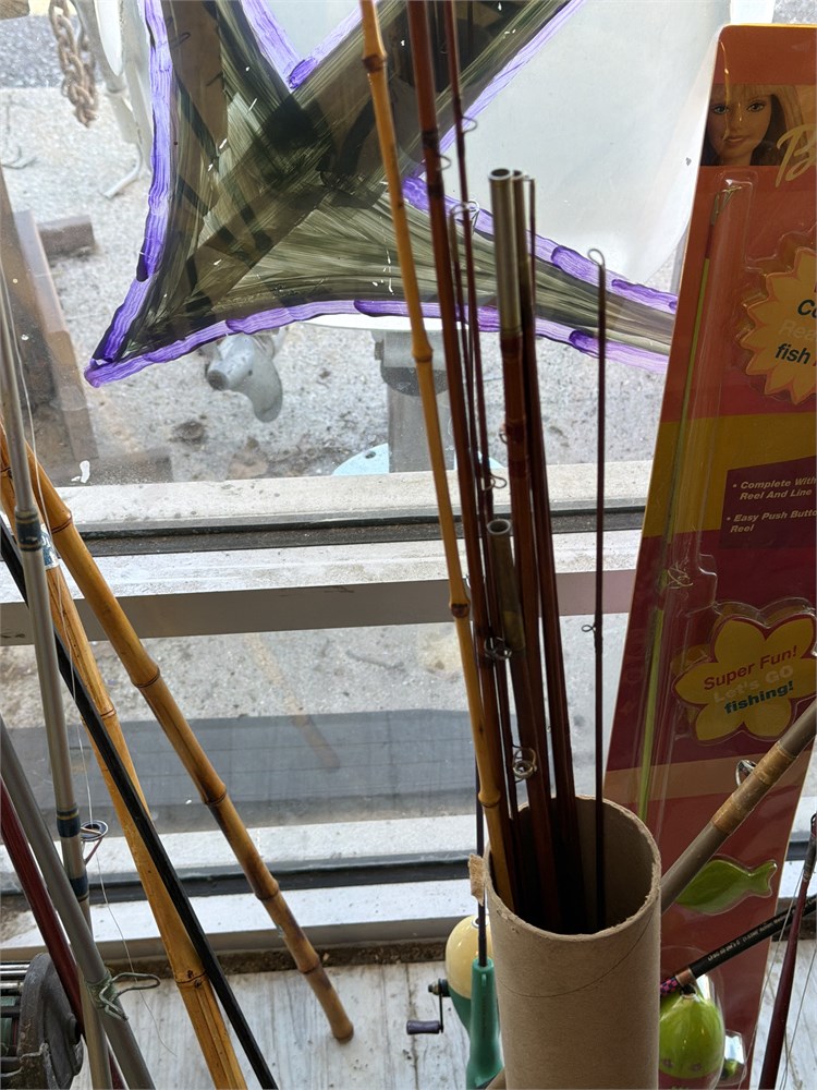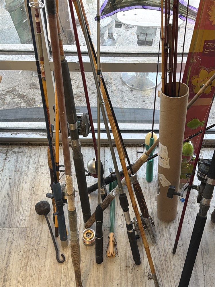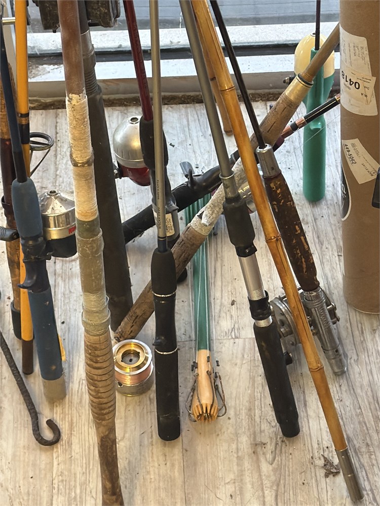 Assortment of bamboo, fishing Rods, conventional reels, fiberglass rods, and reels nice assortment