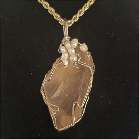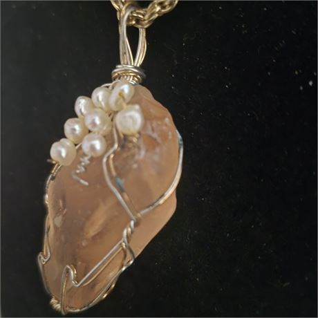 Pendant is wrapped in sterling silver twists adorned with fresh water pearls