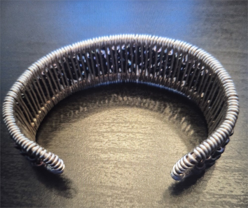 The product is a stunning vintage estate glass beaded silver tone cuff bracelet that measures 6.5 inches in length. This bracelet features intricate beadwork and a cuff design, adding a touch of elegance and sophistication to any outfit.