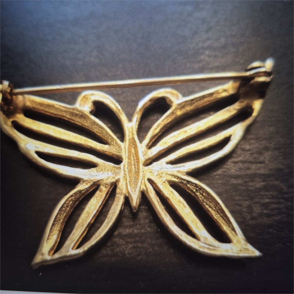 This product is a stunning vintage estate gold tone butterfly brooch measuring 1 7/8 inches. The intricate design and elegant gold tone color make it a beautiful accessory that can add a touch of vintage sophistication to any outfit. Perfect for adding a unique and stylish flair to a lapel, collar, or even a bag,