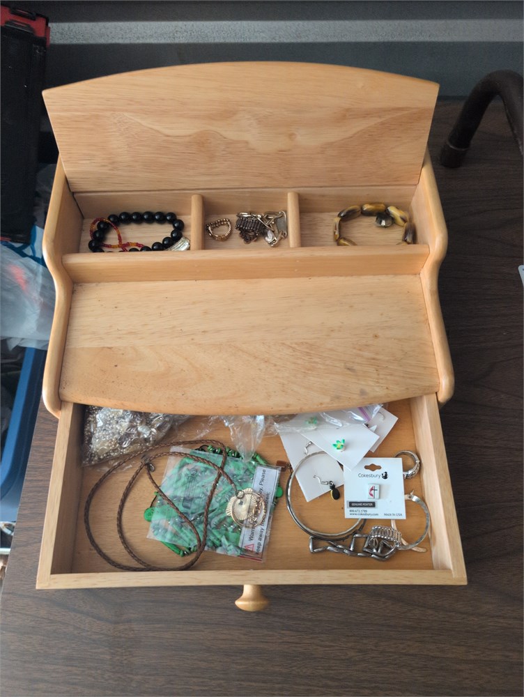 You get the nice jewelry box made of real wood in very good condition and it is filled with miscellaneous jewelry, bracelets, necklaces, earrings, rings, etc, you get it all