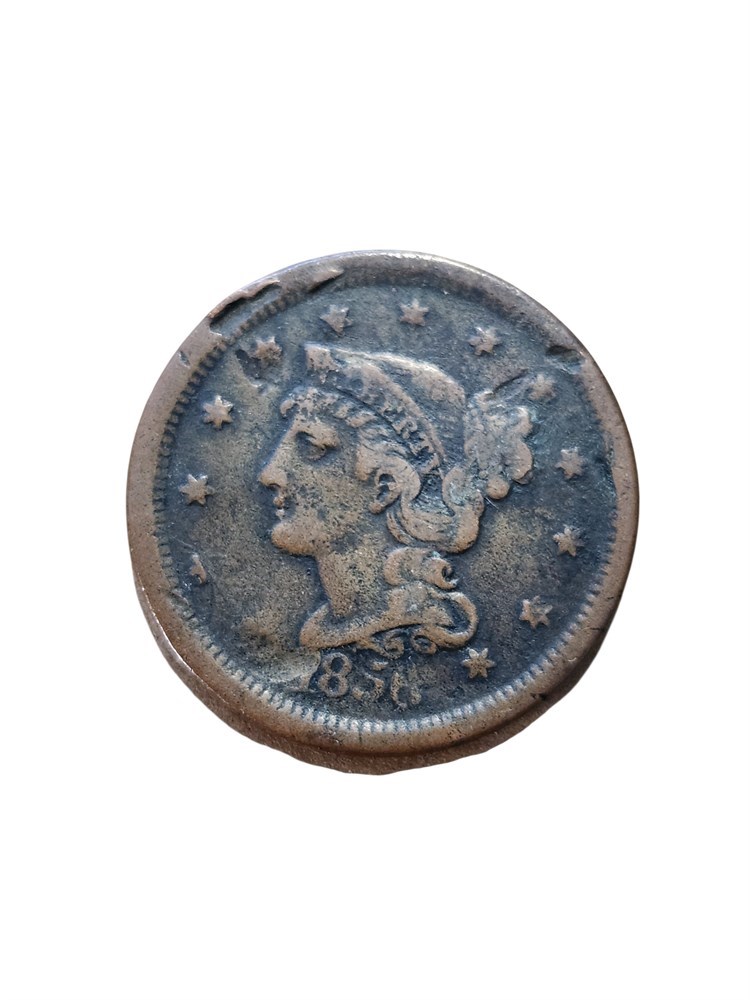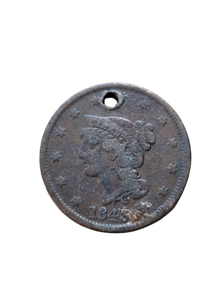 1856 Large Cent, 1843 Large Cent, 1858 Half Dime. The 1843 and the 1858 half dime both had holes drilled in them for necklaces probably.
