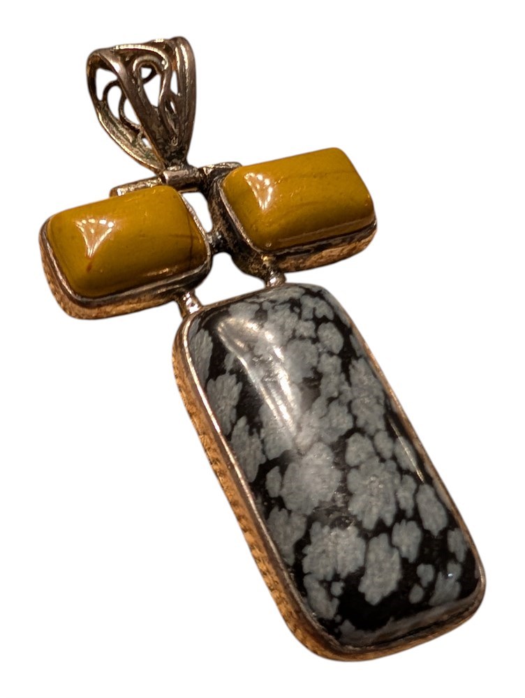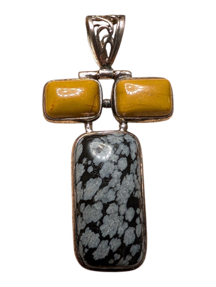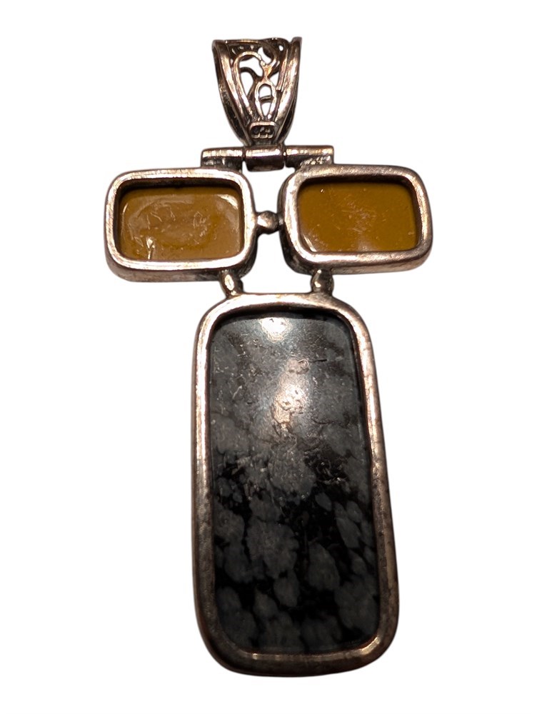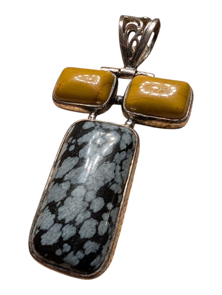 Sterling Silver Snowflake Obsidian & Yellow Agate Pendant ~ 15.6 Grams