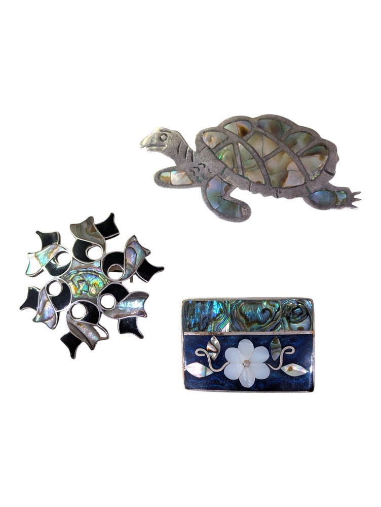Group of 3 Sterling & Mother of Pearl Brooches Taxco ~ 23.4 Grams