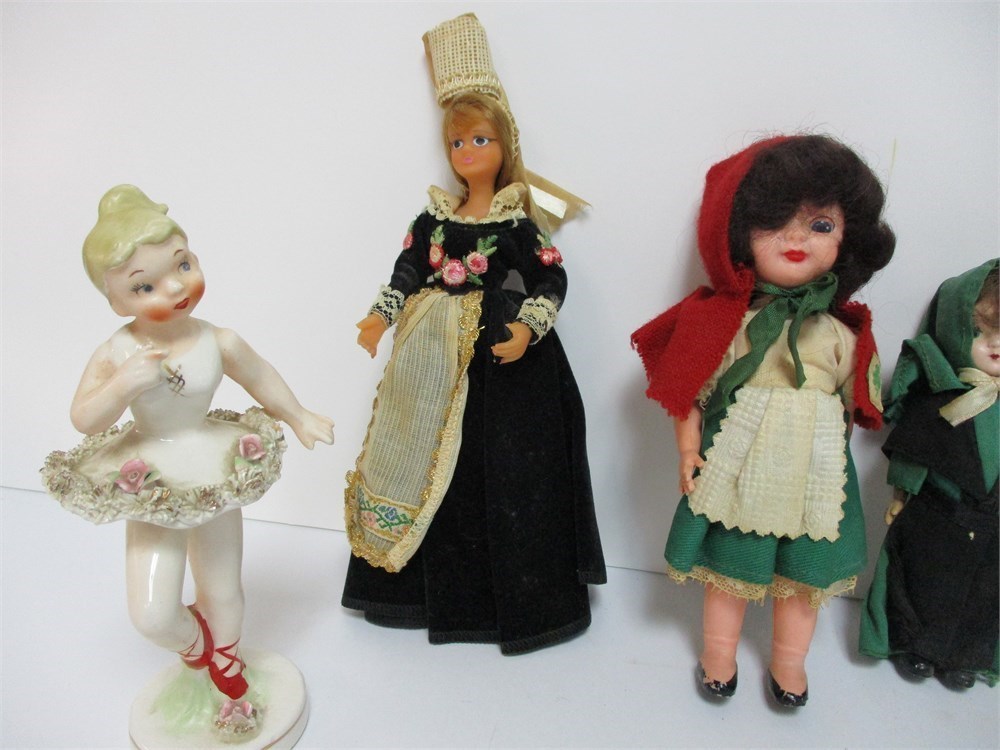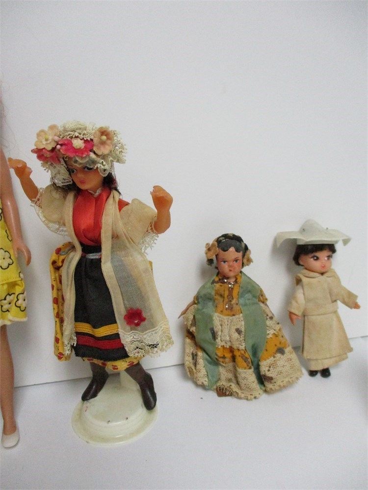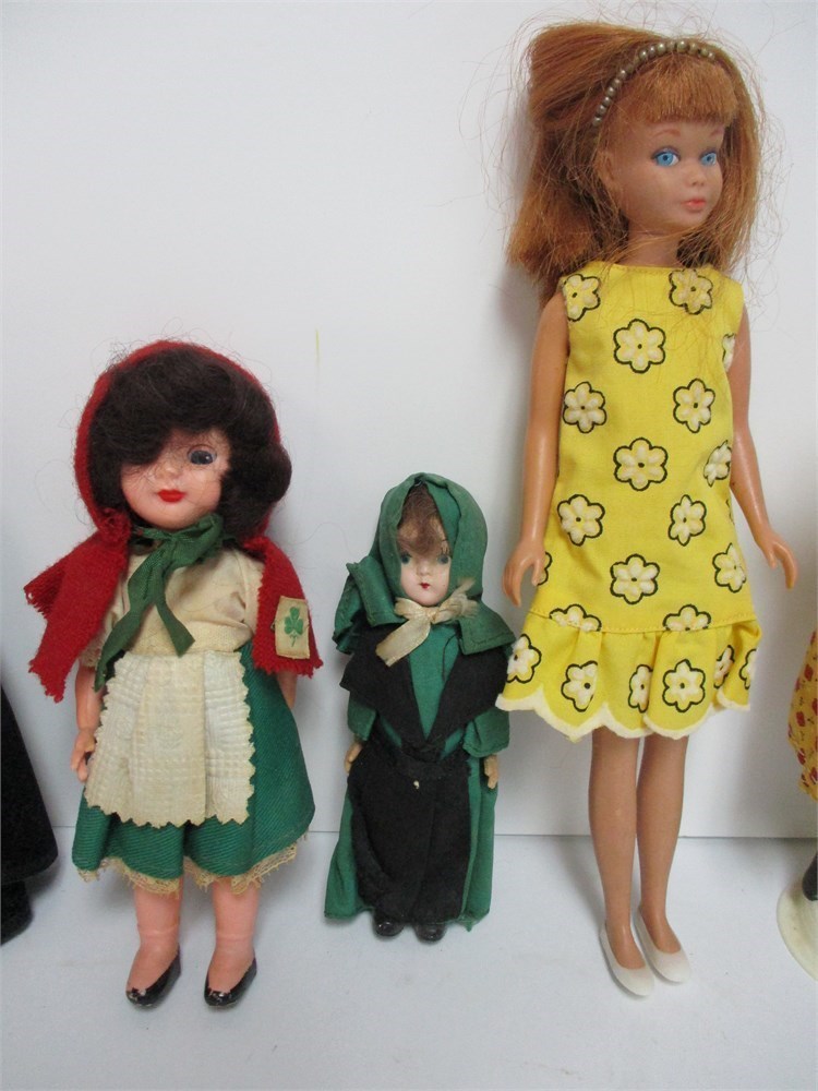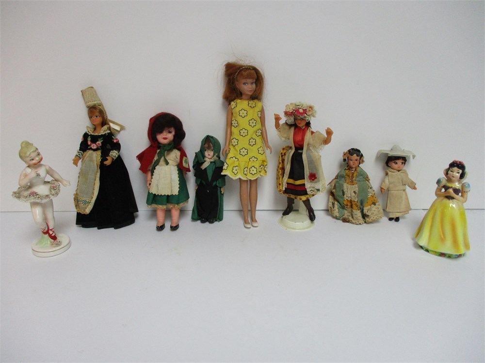 This is a miscellaneous group of vintage dolls, spanning several decades and multiple styles, including international costume dolls, a mid-century Barbie-family doll, and small porcelain figurines. Here’s a breakdown of each type: