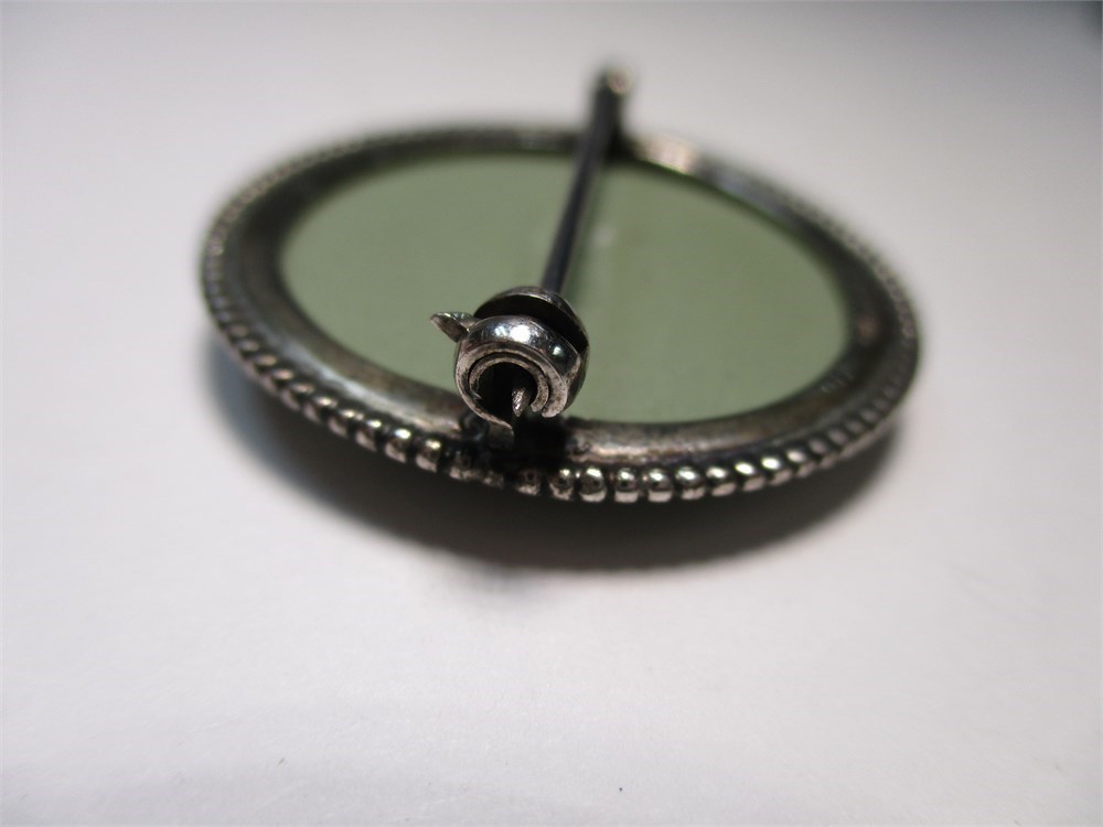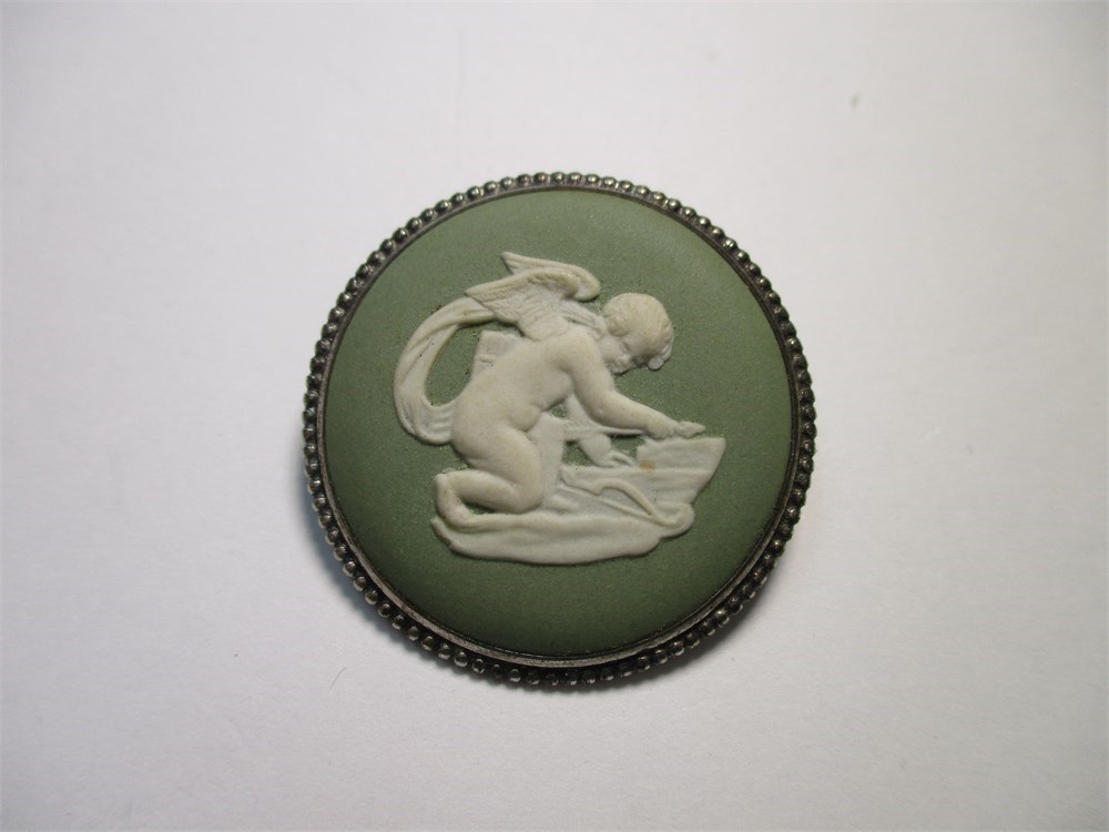 Antique, Sterling Silver & Green Wedgwood Brooch w/ Cherub