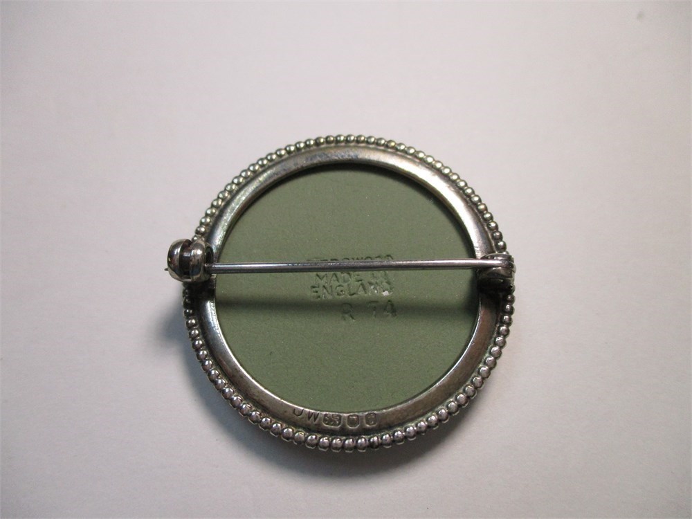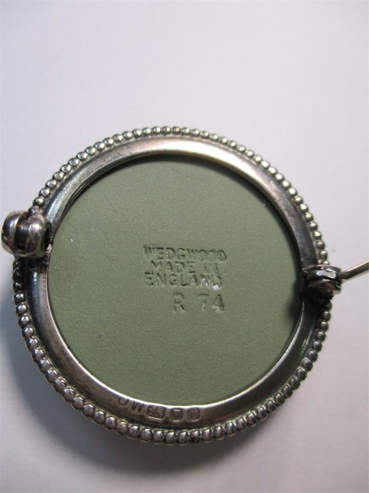 A lovely and simple, Sterling Silver and Green Wedgwood Brooch with Cherub in the center.  The Wedgwood is surrounded by a Sterling rope design.  Stamped Wedgwood Made in England and numbered, and Hallmarked, London 1914, makers mark not clear. It measures 1.25 " in diameter.