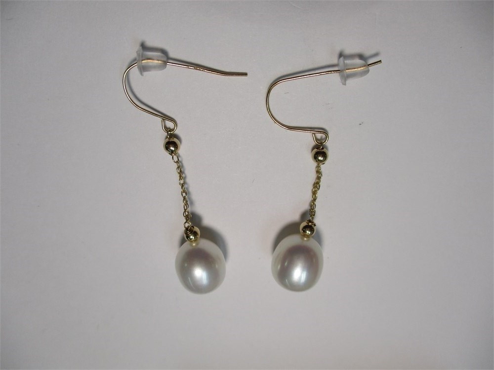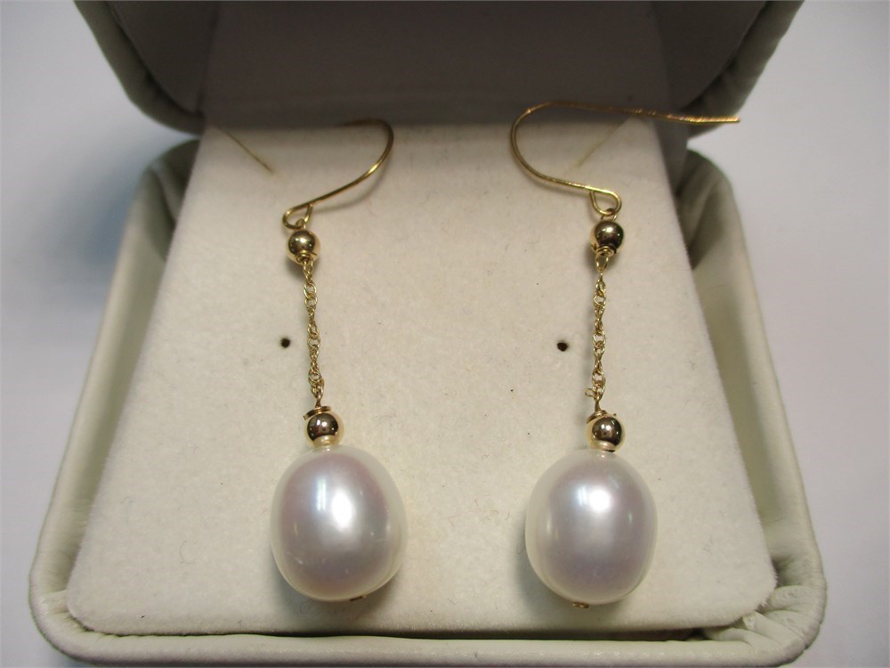 This is a Beautiful pair of  9.5 MM White Cultured Freshwater Pearl, 14K Yellow Gold Dangle Earrings, Shepherd Hooks.