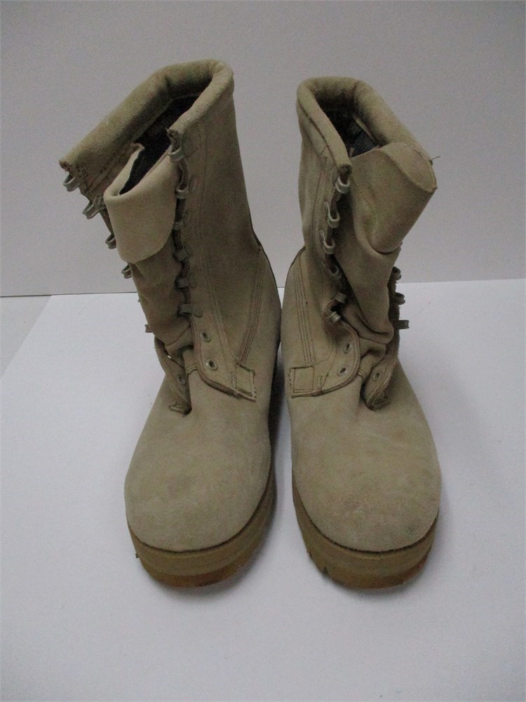 A very nice pair of  Gortex, Tan, Military Boots size 7.5 R.  Very nice, clean condition.  Has no laces but easy to replace.  Thick Vibram Lug Soles.