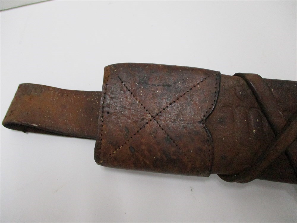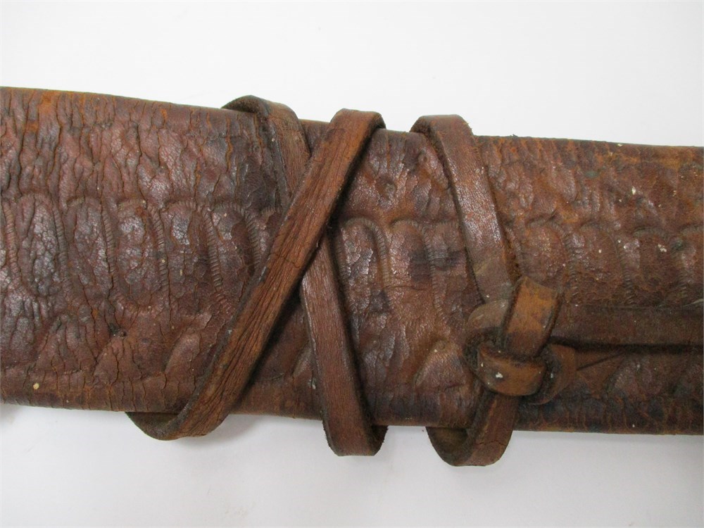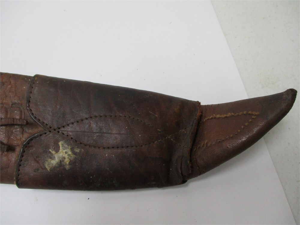 A very nice vintage/antique, Leather Machete Sheath.  Very nice embossing on the sheath, hand-stitched, and nice workmanship in general.  It measures 28.5" in length.  Normal age related wear.