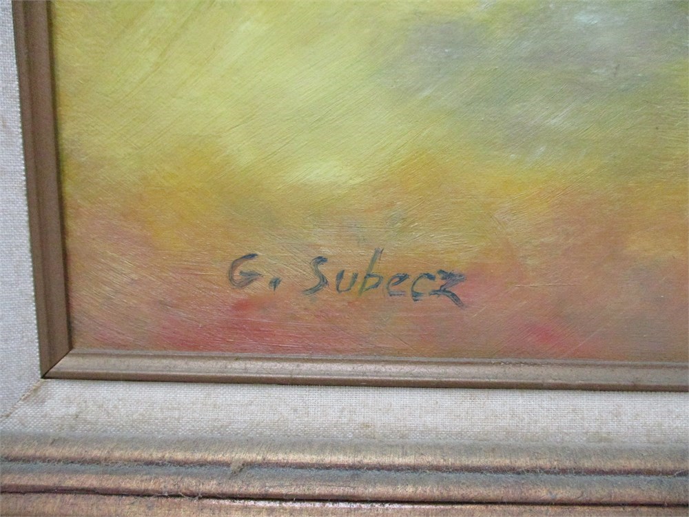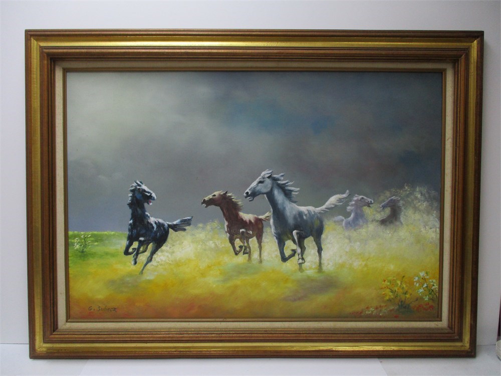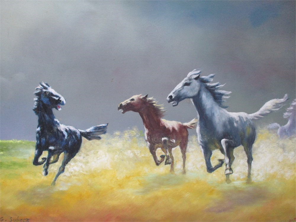 This is a lovely, vintage, Framed Oil on Canvas on Horses running in a field.  The colors are lovely.  It is framed in a stained wood and gilt frame.  A large piece that measures 24x36.  Ready for hanging. Signed "G. Subecz".