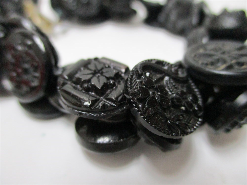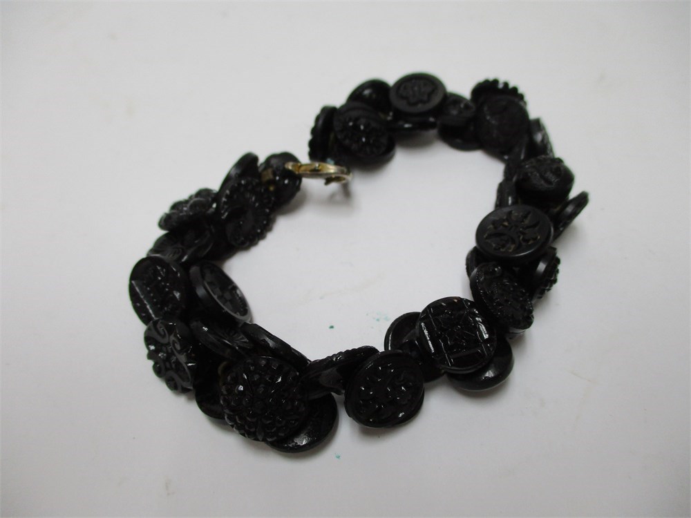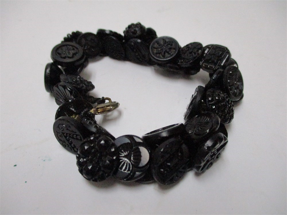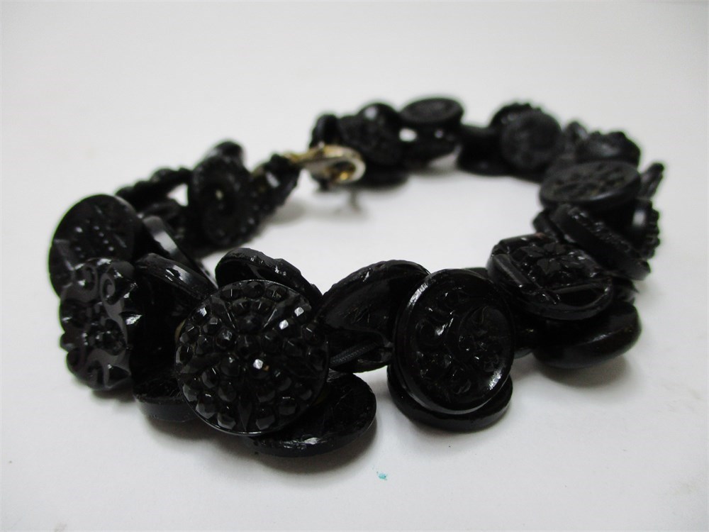 Victorian Jet,Black Glass Charm String Bracelet,Antique Buttons,Mourning Jewelry