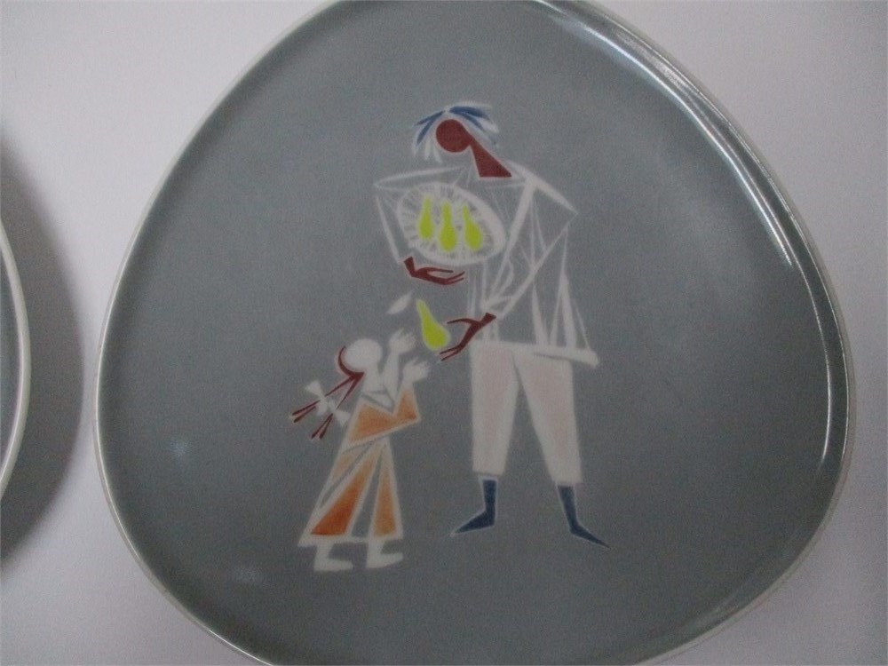 This is a 6 piece set of vintage Mid-Century Modern porcelain plates, which was designed by the acclaimed German artist Hilda Sandtner for the Rosenthal Art Department in Selb, Germany, likely in the 1950's.  The plates feature a bold, mid-century style graphic design of stylized figures, possibly with fruits or birds, against a gray background. The specific pattern in the image appears to depict figures in a social or market setting, sometimes referred to as "Farmers Market" or "Damenkapelle" in related listings.