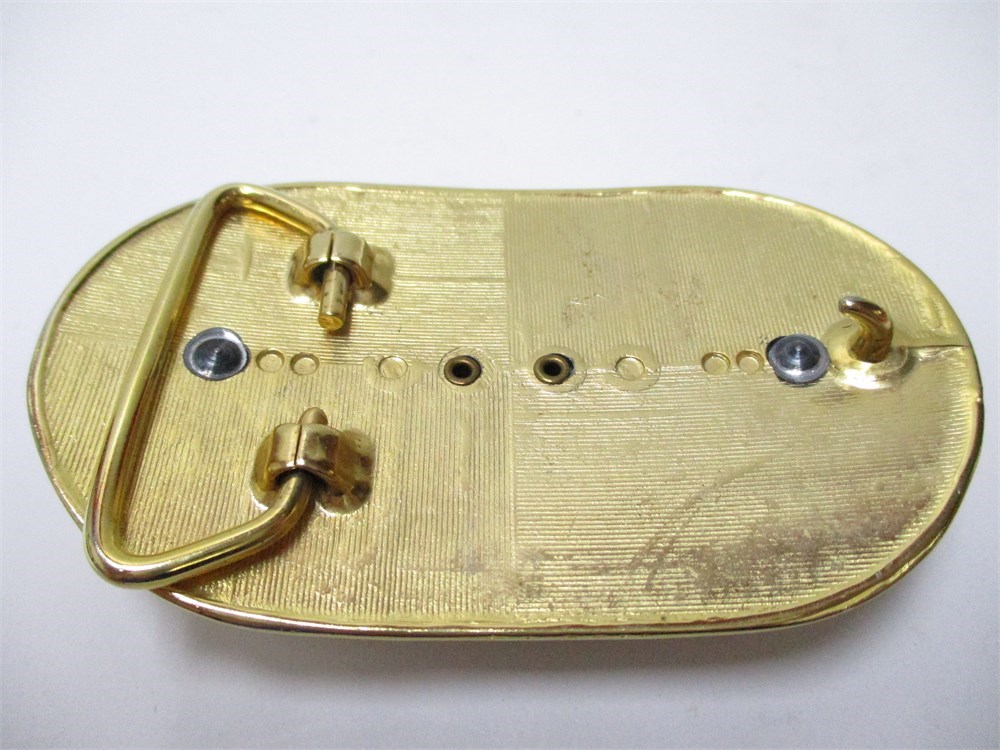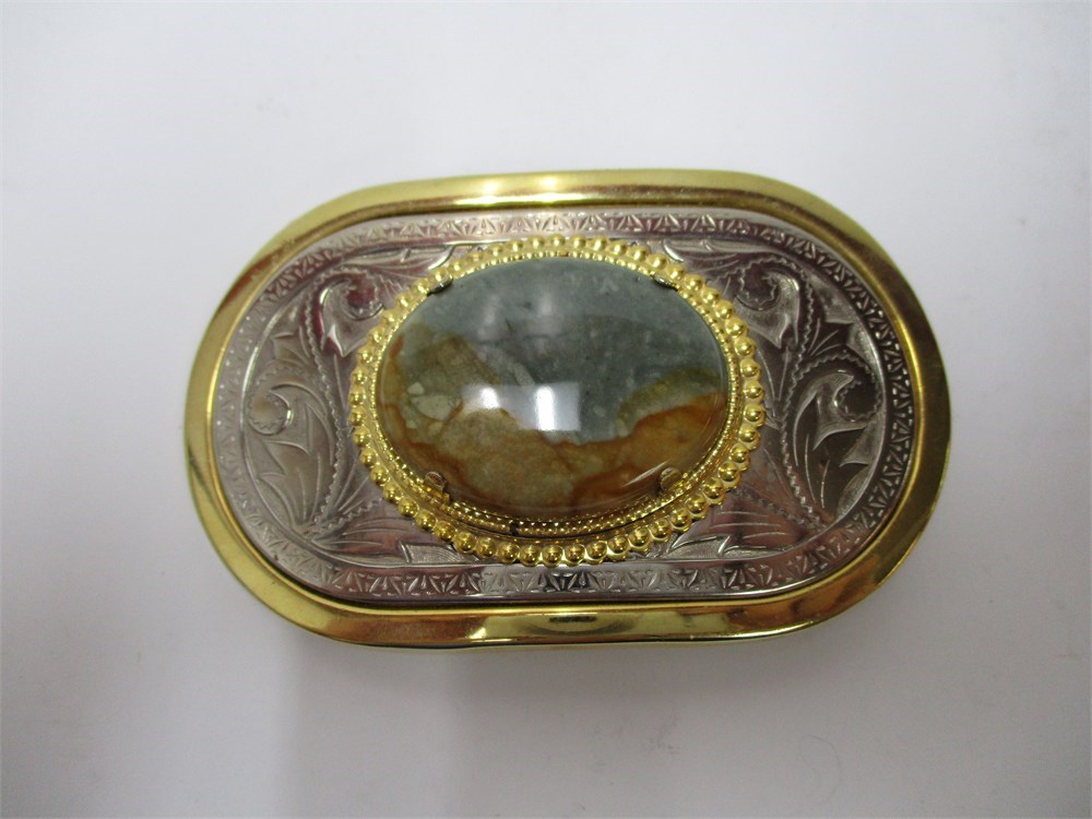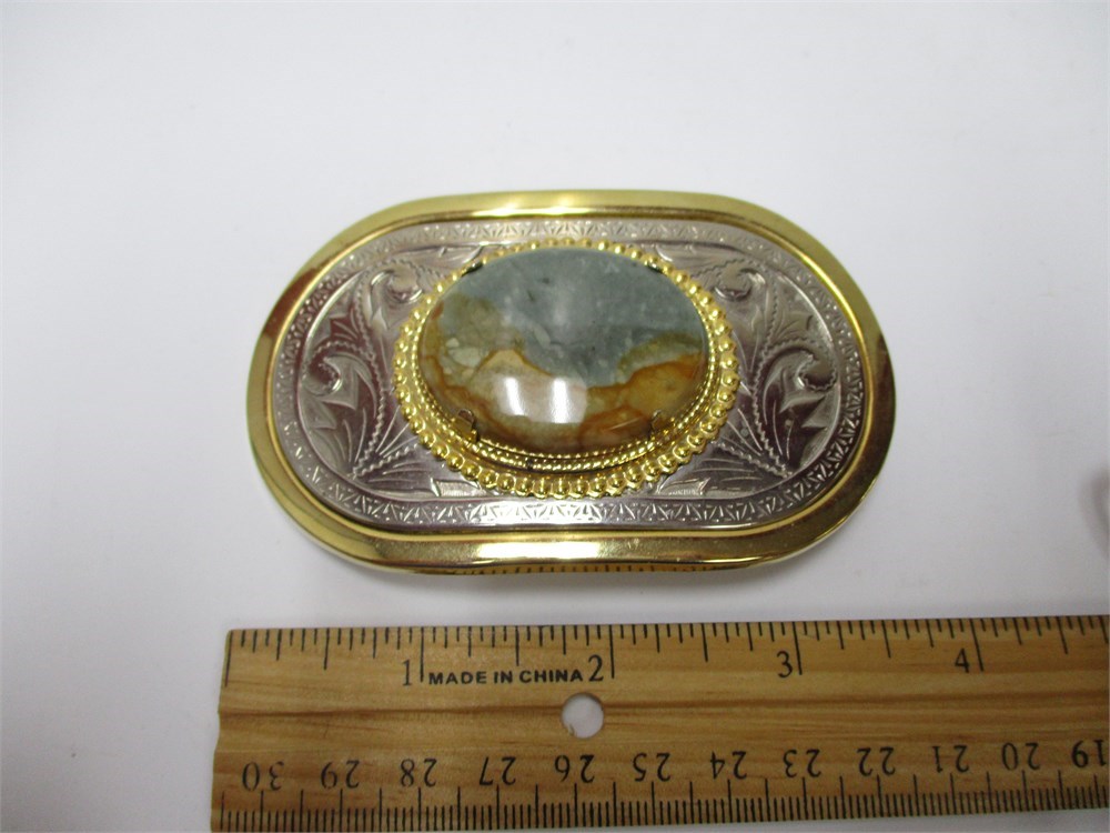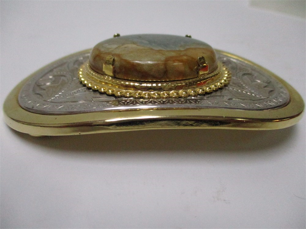 A large man's or woman's two-tone belt buckle with a large prong set Jasper stone in the center.  It is in very nice condition.