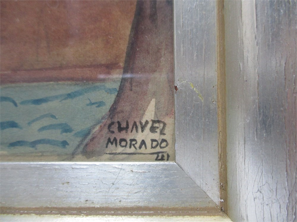 This is a FABULOUS Original Watercolor by Chavez Morado (1909-2002), and is titled "Morelia" which is a city in Michoacan, Mexico.  Chavez was a major and highly respected Mexican artist, associated with the Mexican muralist movement.  The details and colors are amazing!  The label on the back shows that this particular piece was on exhibit at the Twenty-second Chicago Art Institutes International Exhibition of Water Colors in 1943. This was a very prestigious event from 1910-1950's.  This was an INVITED ONLY event meaning that the artist was selected directly by the museum's curators - not submitted through open entries.  The 1943 edition featured top American and international watercolorists, but being held during WW11, it limited European participation, giving prominence to Mexican and Latin American artist.  This label is historically significant because it documents that Chavez Morado exhibited in the United States in 1943 during a key movement for Mexican modernism. It is perfectly framed for this piece.  The paper back has some tears at the top, it still has the label from the framer in Chicago and the Exhibition label. It measures 11x14 and ready for hanging.  An awesome and historical piece !