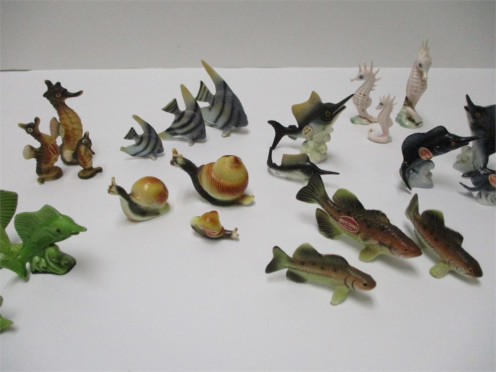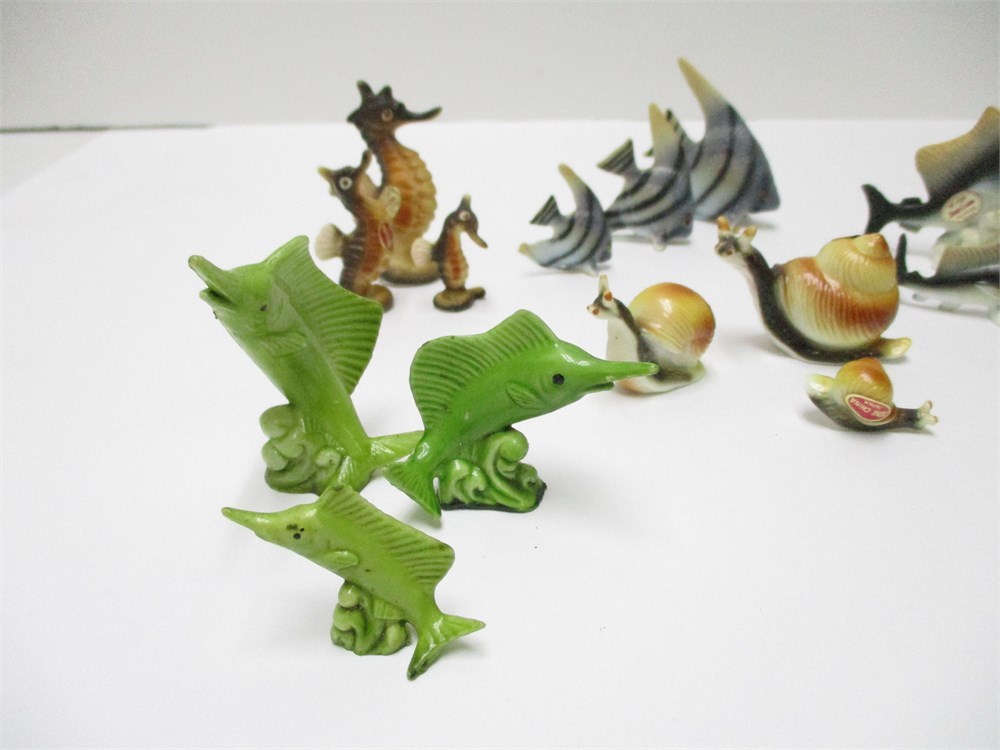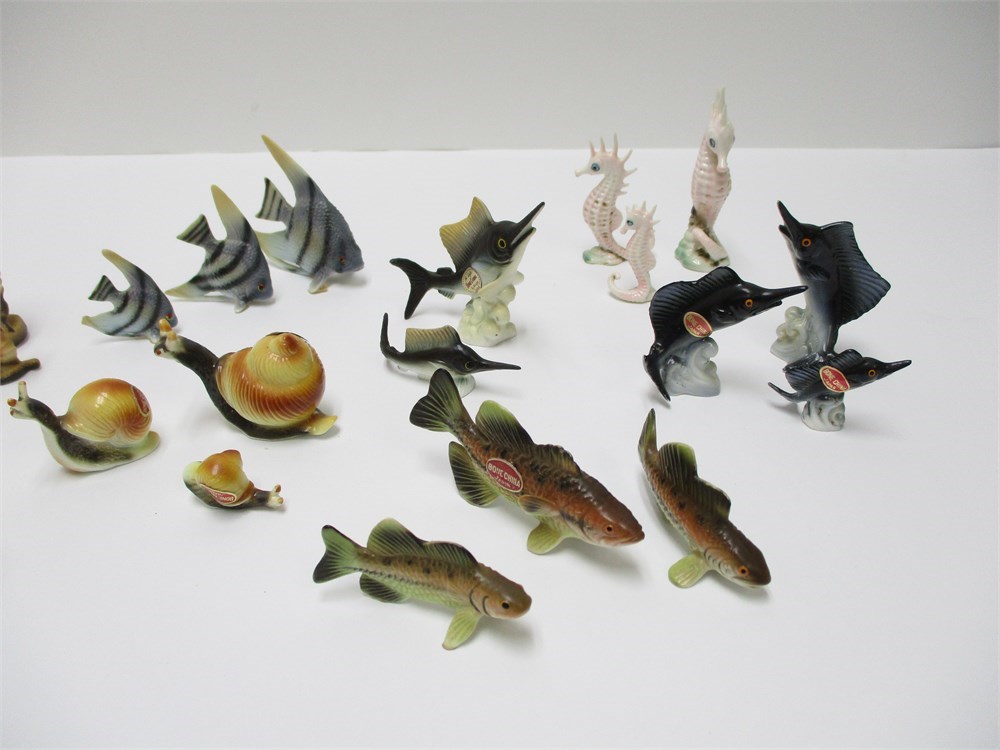 A wonderful vintage 23 piece lot of miniature, fish, bone china Japan.  The lot includes all different kinds of fish including snails.  They are in wonderful condition and the colors and detail is great !  Measuring from 1" to 2 tall.  T