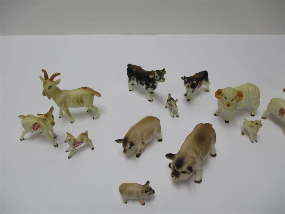 A wonderful vintage 17 piece lot of miniature farm animals, bone china, Japan.  The lot includes a variety of farm animals. They are in wonderful condition and the colors and detail is great !  Measuring from .75" to 2.5" tall.