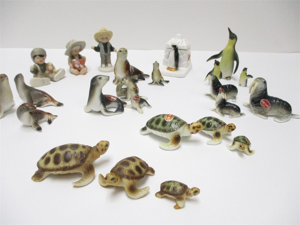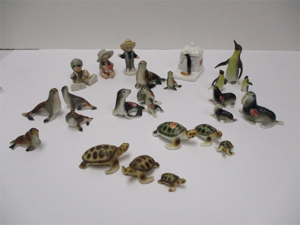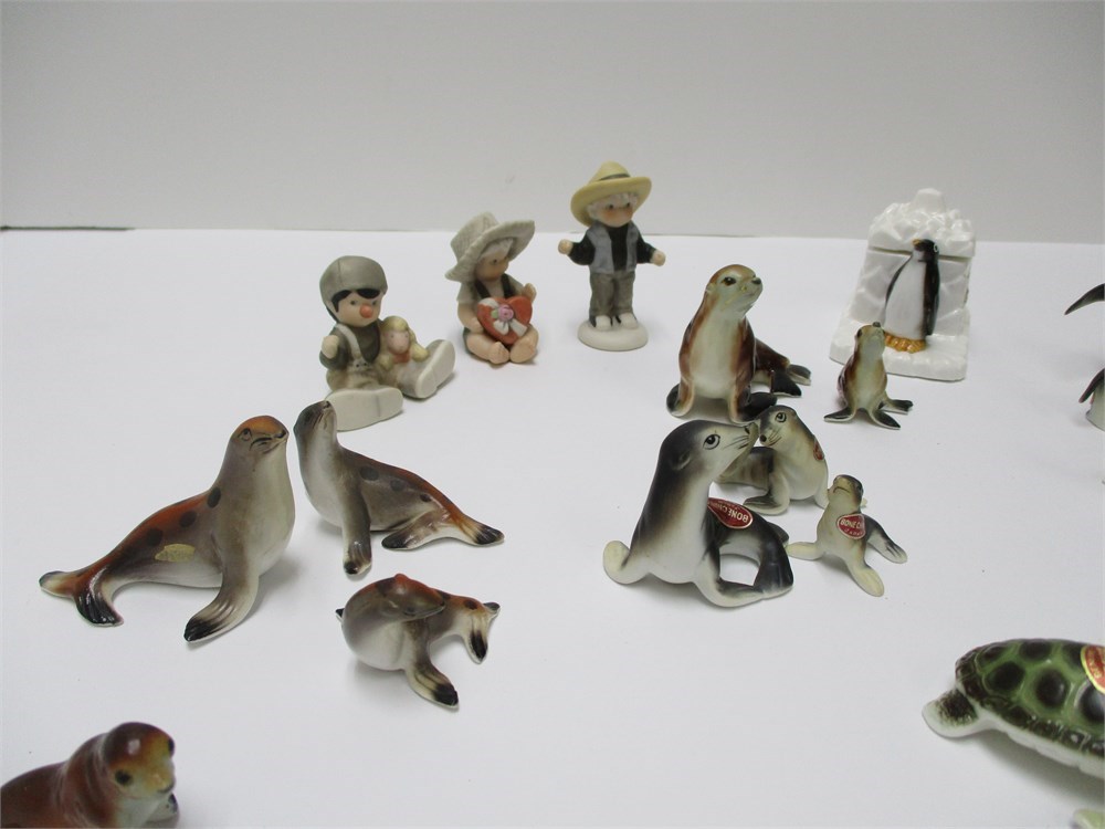 A wonderful vintage 25 piece lot of miniature, ocean mammals, bone china, Japan.  The lot includes a wonderful variety and also includes 3 miniature figurines of children from NBM Bahner Studios Indonesia 1999, and a penguin trinket box from Sea World. They are in wonderful condition and the colors and detail is great !  Measuring from 1" to 3" tall.