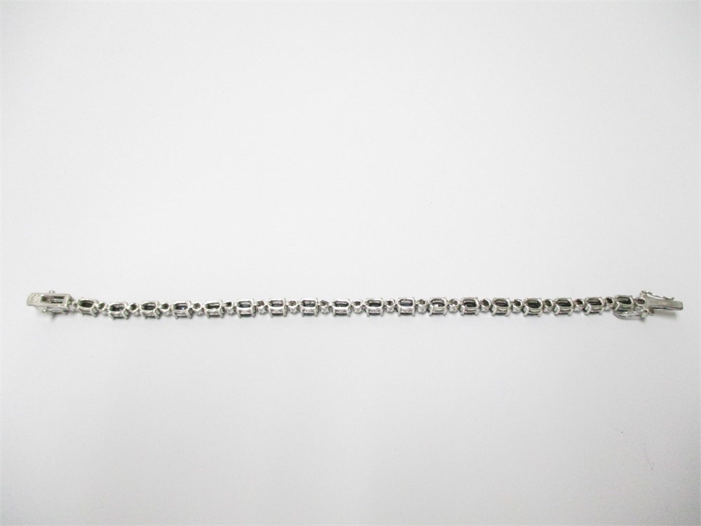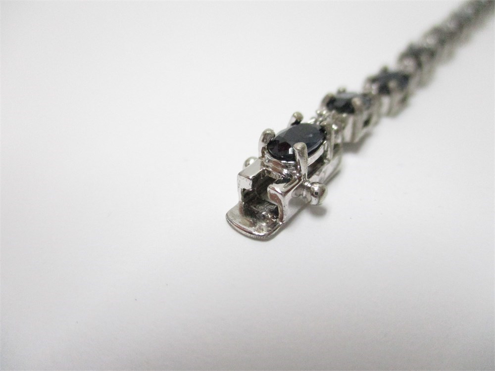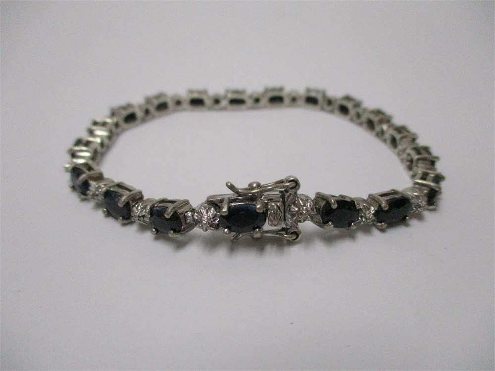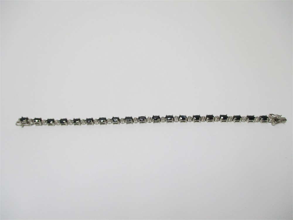 A lovely vintage, Sterling Silver and Faceted Oval Sapphire Link Bracelet.  There are 19 Oval Sapphire stones, all prong set in Sterling Silver.  It has a tongue and groove clasp and two figure eight safety catches for added security.  It measures 7.5" long and in wonderful condition, just might need  little polish.