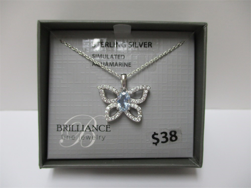 Brilliance, Sterling Silver, Simulated  Aquamarine & CZ Necklace, 18" Chain.  Boxed and ready for gifting.