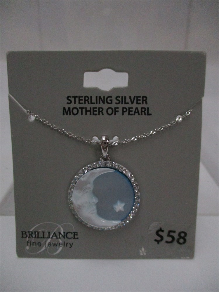 Brilliance,  Sterling & Genuine Mother of Pearl, Moon, Star & Crystal Necklace, 18" Chain.  Ready for gifting.