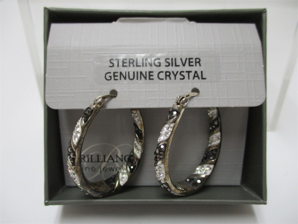 Brilliance, Sterling, Black & Clear Crystal Oval Hoop Lever Back Earrings. Boxed and ready for gifting.
