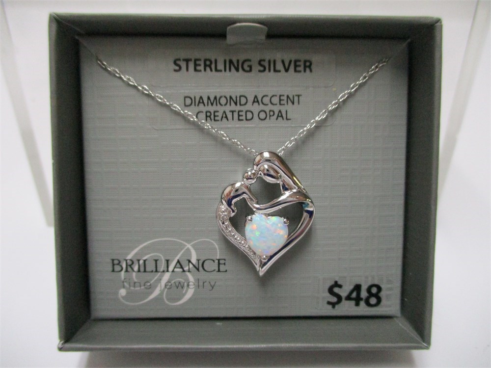 Brilliance, Sterling & Simulated Heart shaped Opal w/Diamond Accents, Heart Pendant Necklace, 18" chain.  Boxed and ready for gifting.