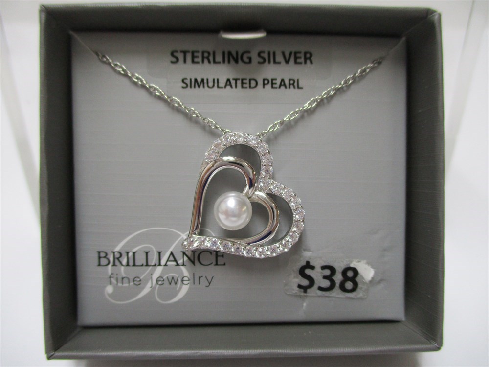 Brilliance, Sterling & Simulated Pearl & CZ Heart Pendant Necklace # 20