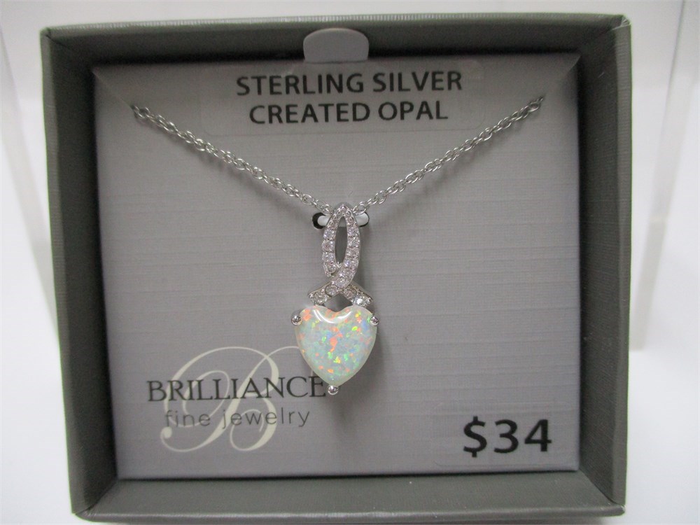 Brilliance, Sterling & Created Opal & CZ, Heart Shape Pendant Necklace, 18" chain.  Boxed and ready for gifting.