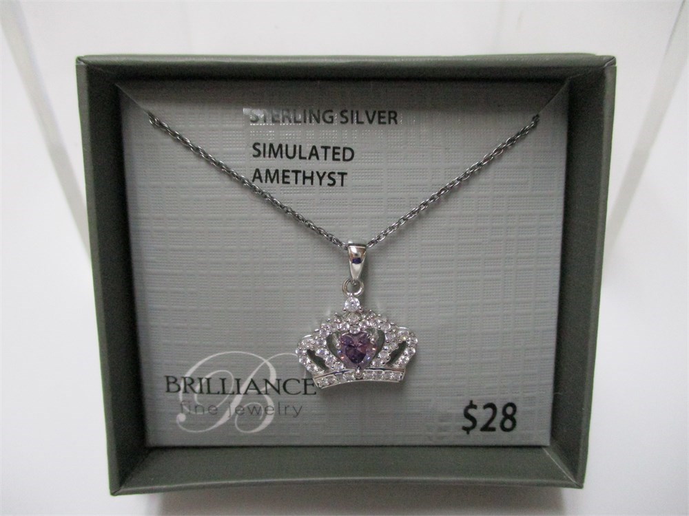 Brilliance, Sterling, CZ & Simulated Amethyst Heart, Crown Pendant Necklace #35