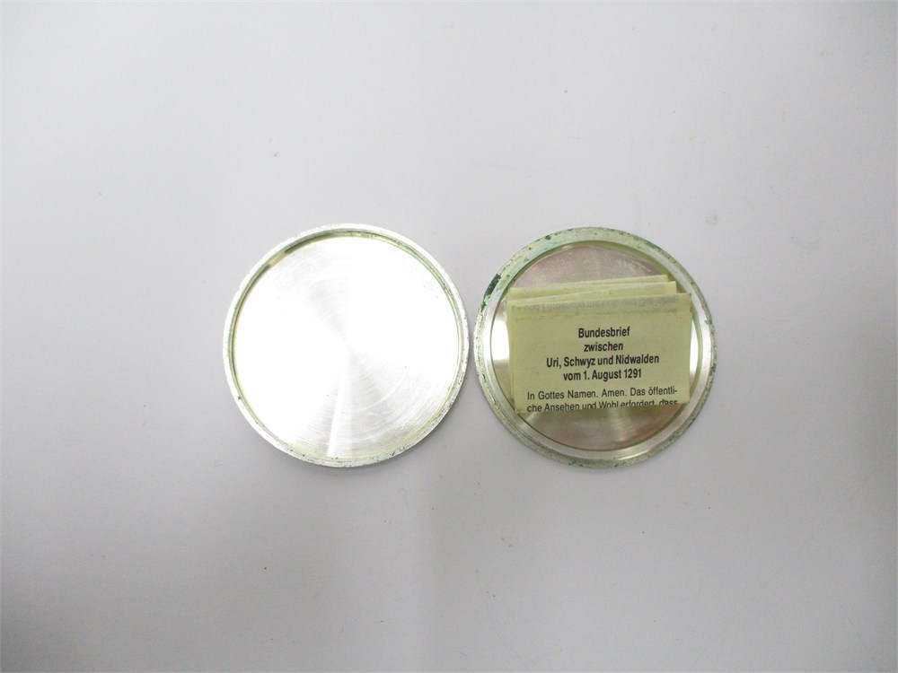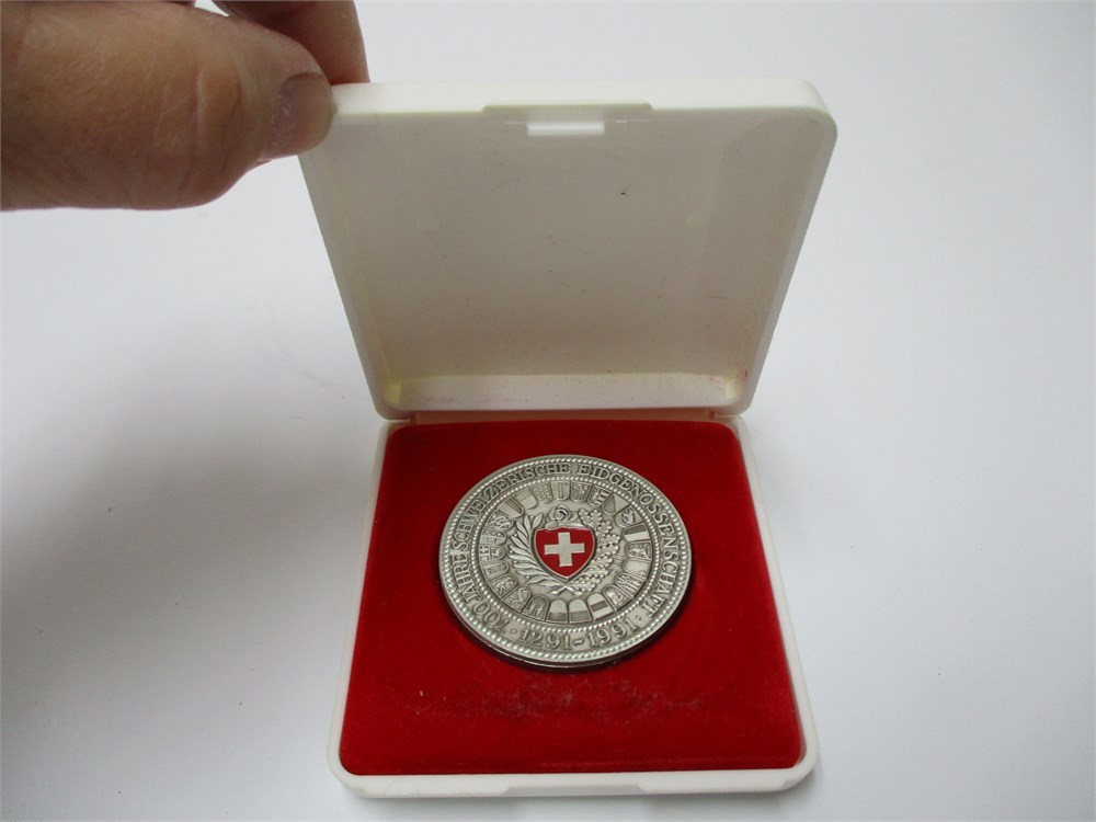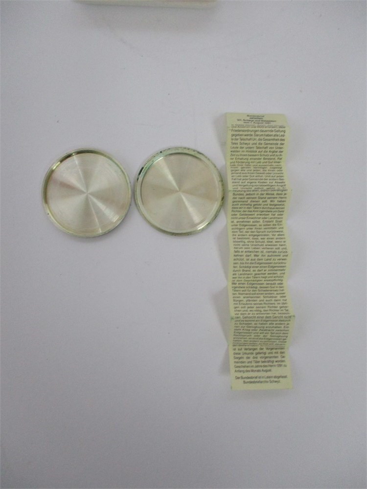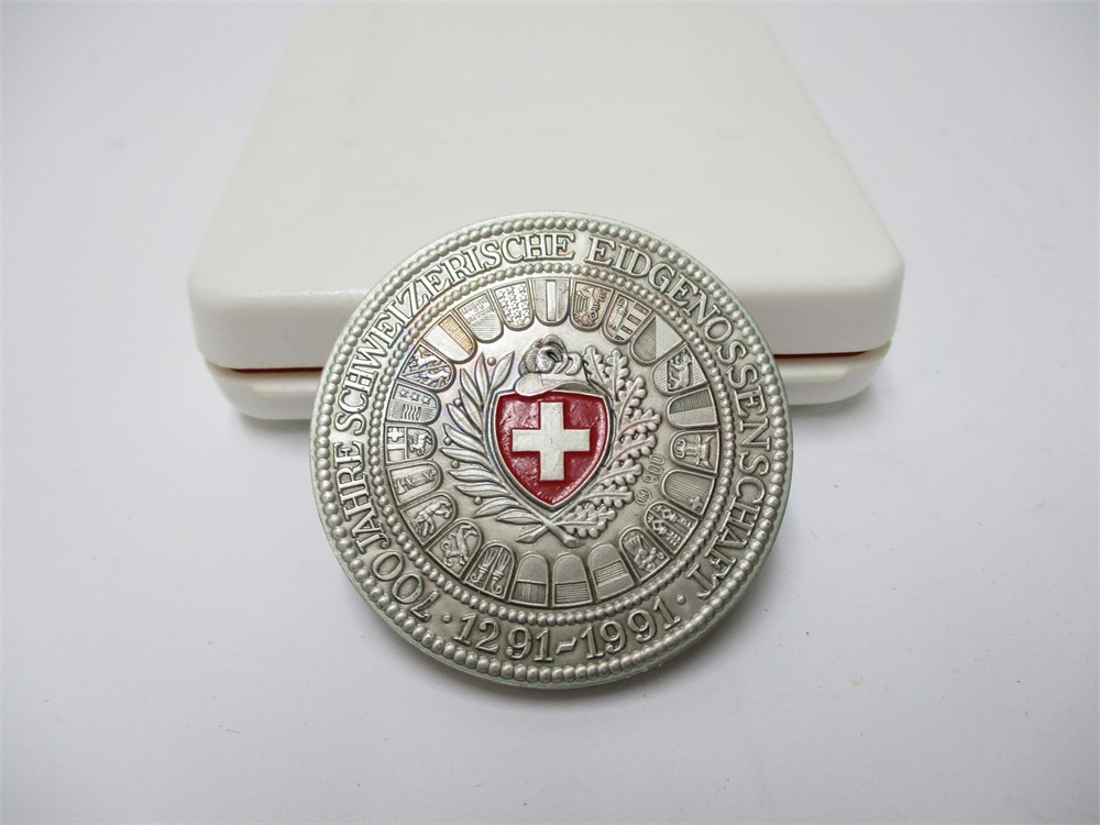 This is a Vintage, Swiss, Commemorative Medal/Token celebrating the 700th Anniversary of the Swiss Confederation, 1291-1991.  The text around the rim "700 JAHRE SCHWEIZERISCHE EIDGENOSSENSCAFT"  German for 700 years Swiss Confederation.  The Swiss National Shield is in the center and surrounding it a ring of Swiss cantonal coats of arms with decorative laurel/foliage elements and beaded rim.  It unscrews to reveal a folded paper with the document of the Swiss Charter.  Very nice vintage piece that comes in its original box.  The medal itself measure 1 5/8" in diameter.  Approximately 41.85 grams.